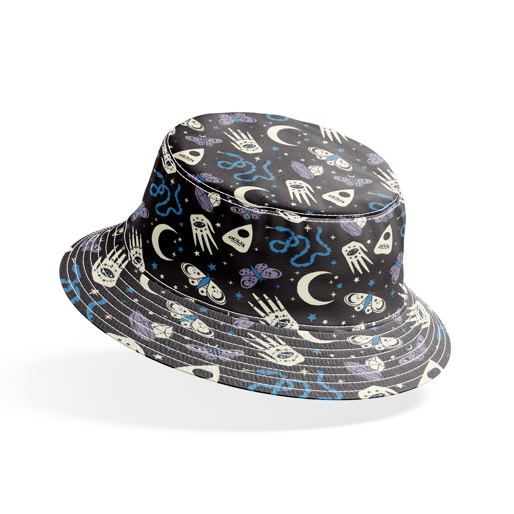 Mystical Ouija toss featuring the crescent moon, planchette, orange snake, butterflies, and crystals on a black background. Perfect for witchy home decor.
