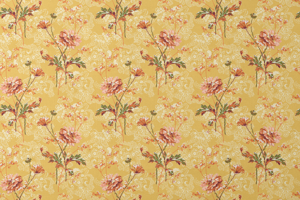 Elegant botanical paisley pattern featuring delicate peony blooms and scattered florals on a golden yellow background, creating a sophisticated vintage feel with romantic appeal.