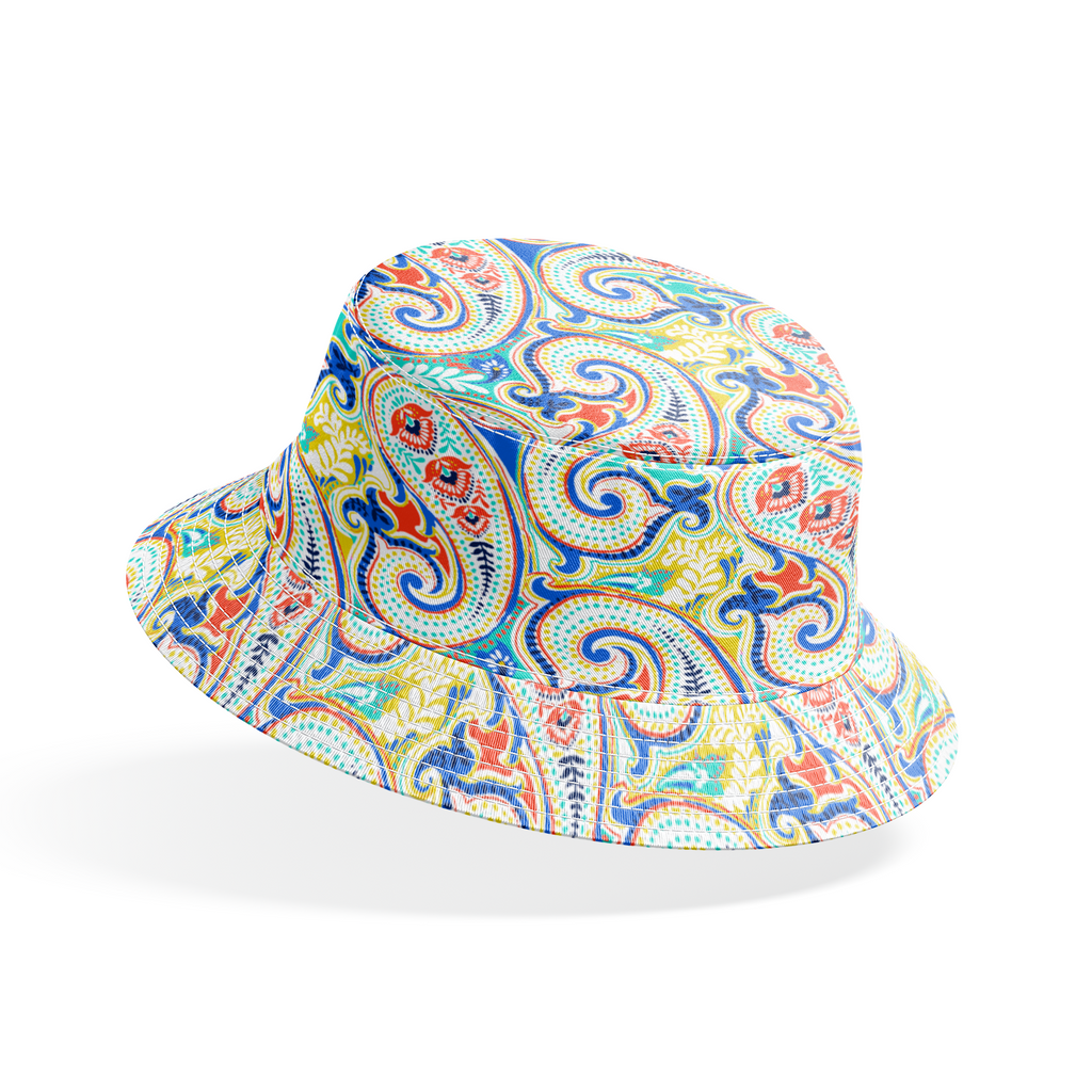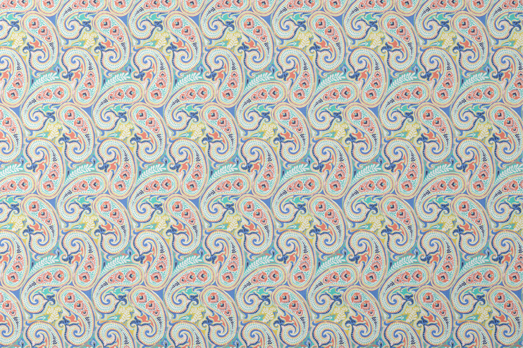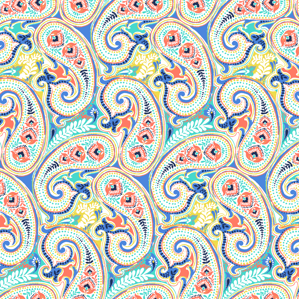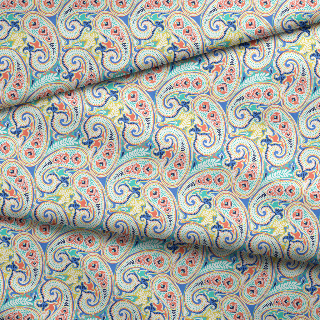 Vibrant paisley pattern with swirling curves and flowing lines in blue, yellow and coral creates a classic bohemian aesthetic, perfect for sewing both home decor and apparel.