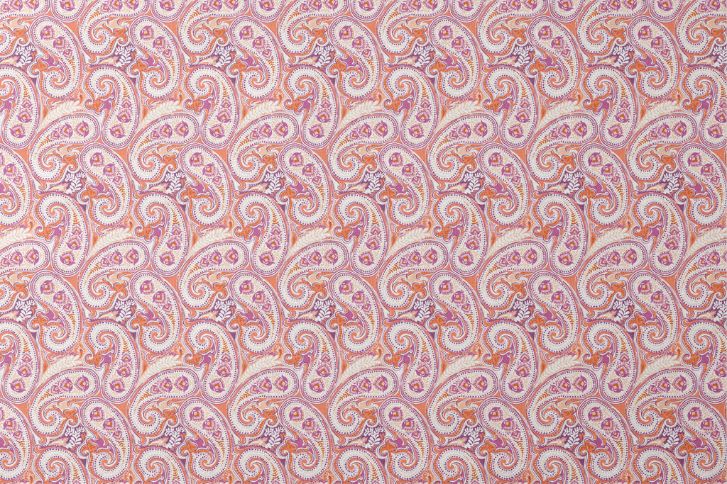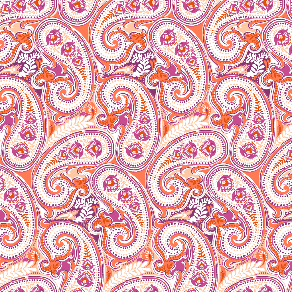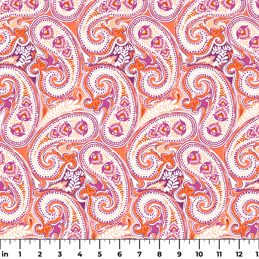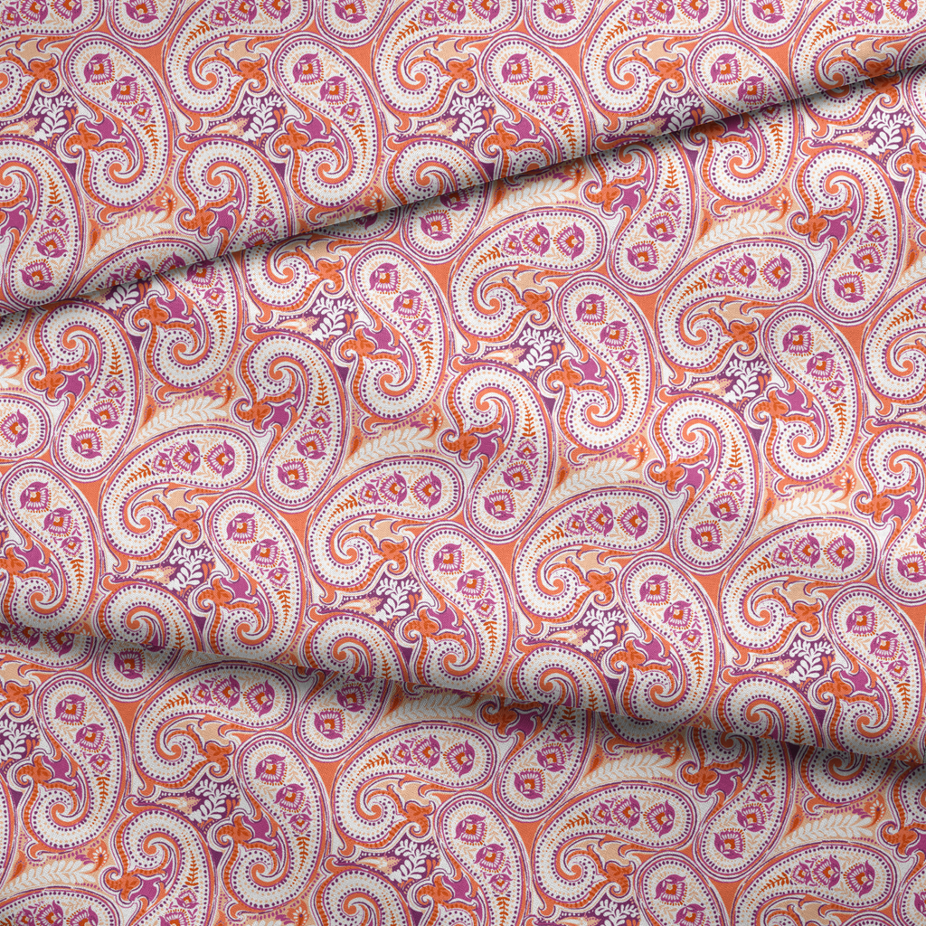 Vibrant paisley pattern with swirling curves and flowing lines in orange-rose and pink creates a classic bohemian aesthetic, perfect for sewing both home decor and apparel.