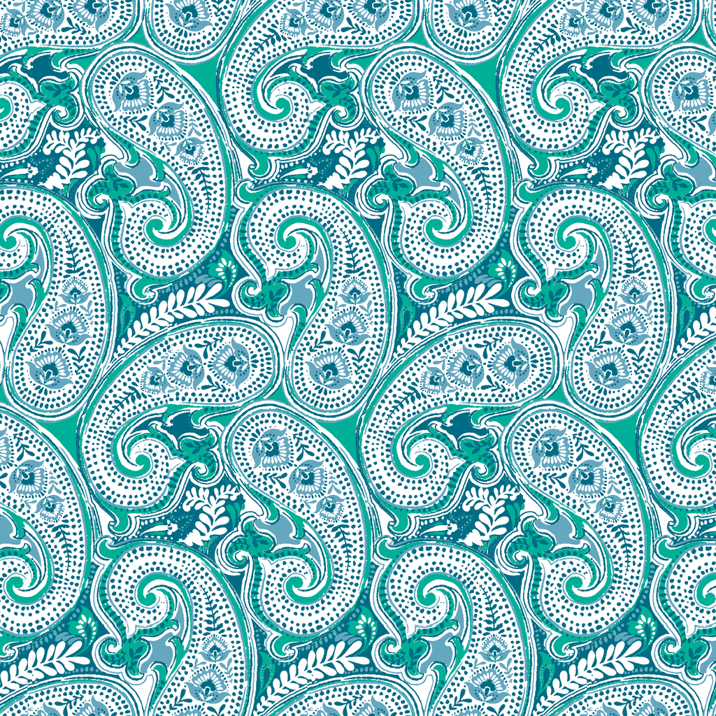 Elegant turquoise and white paisley pattern featuring intricate swirls and delicate floral details in a classic bohemian style perfect for a vintage-inspired look for any space.