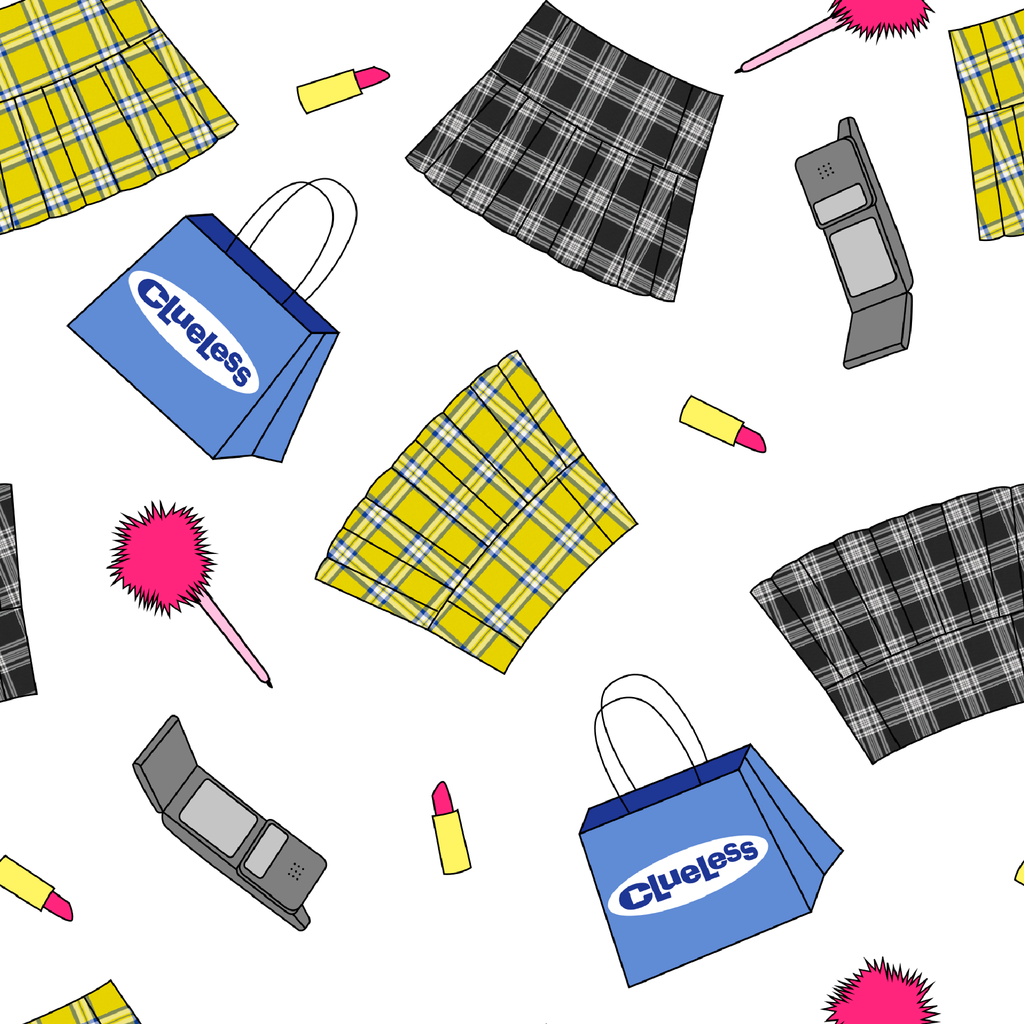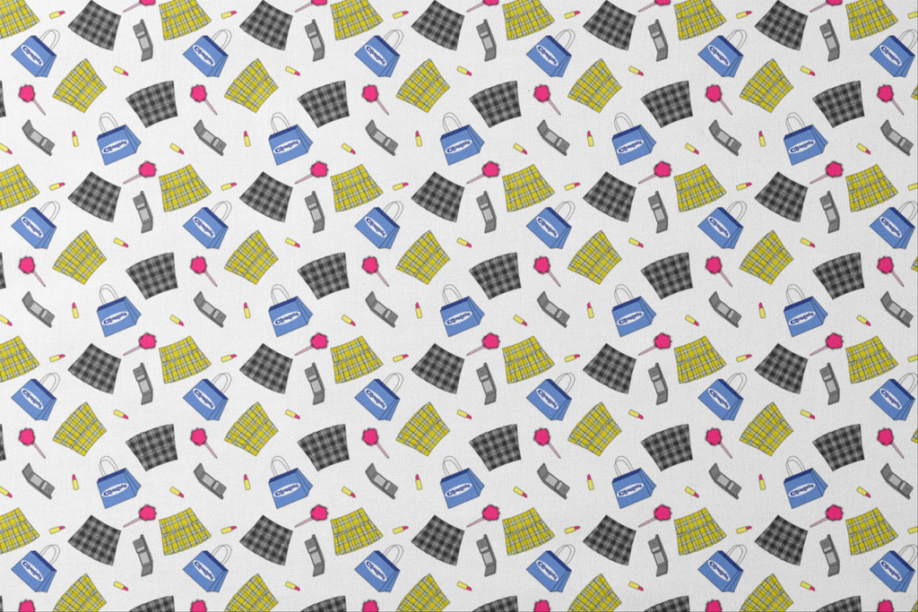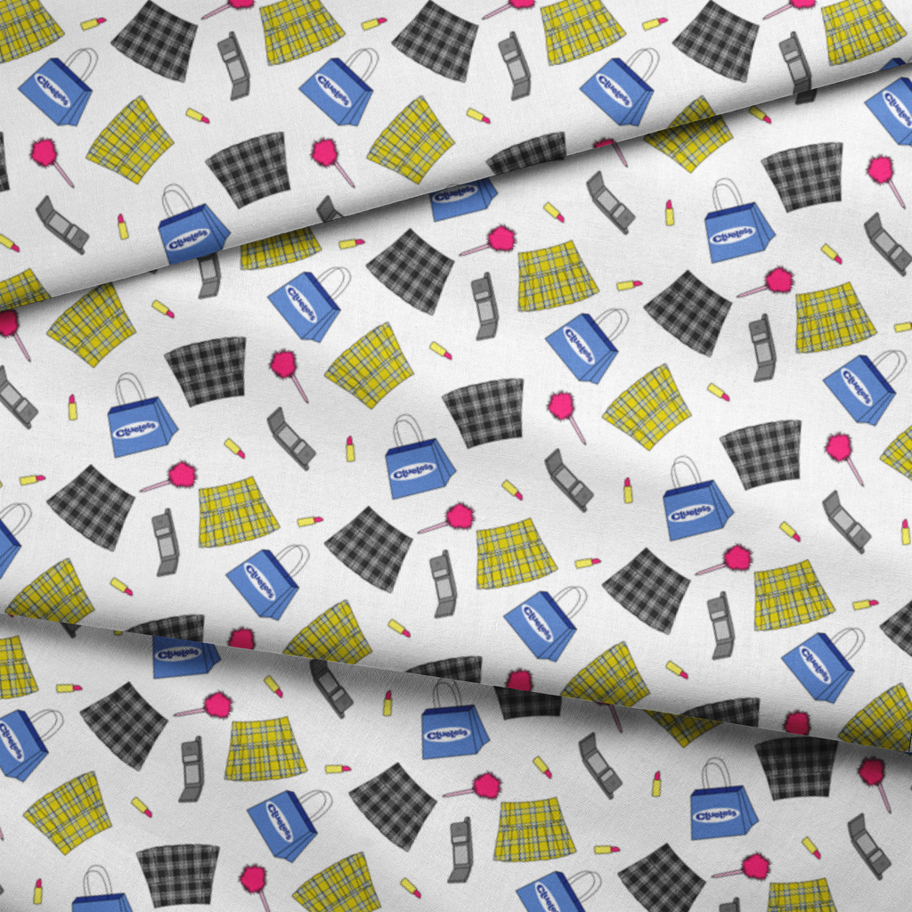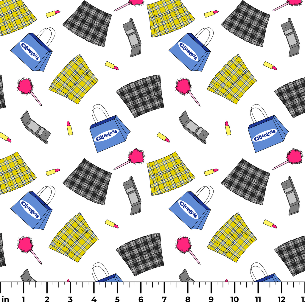 Step back into the '90s with this playful Clueless-inspired fabric featuring iconic motifs from the cult classic film. Bold yellow and black plaid skirts, blue shopping bags, vintage flip phones, and hot pink fuzzy pens scatter across a crisp white background in a whimsical tossed pattern. Perfect for crafting nostalgic accessories, trendy tote bags, or statement apparel pieces that will have fellow film buffs totally buggin'.