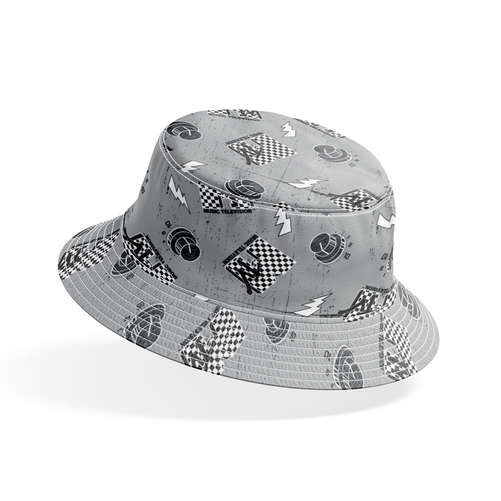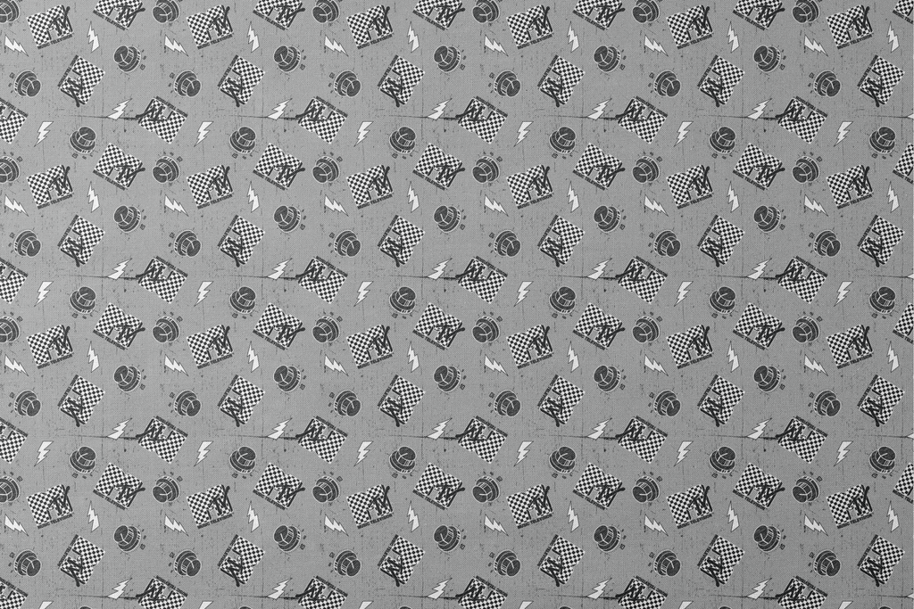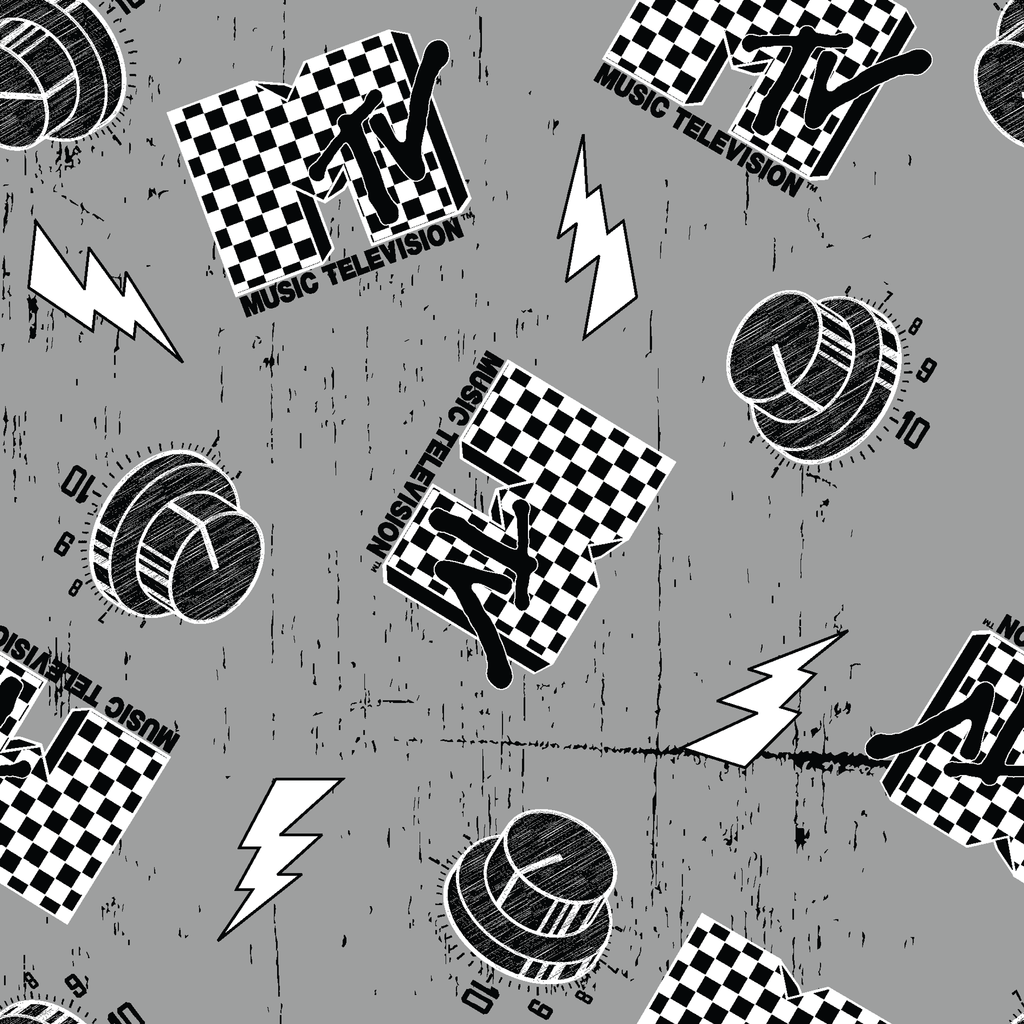 Retro racing pattern with checkered MTV logos, lightning bolts, and motorsport elements on a textured gray background. Perfect for sports-themed apparel and home decor.