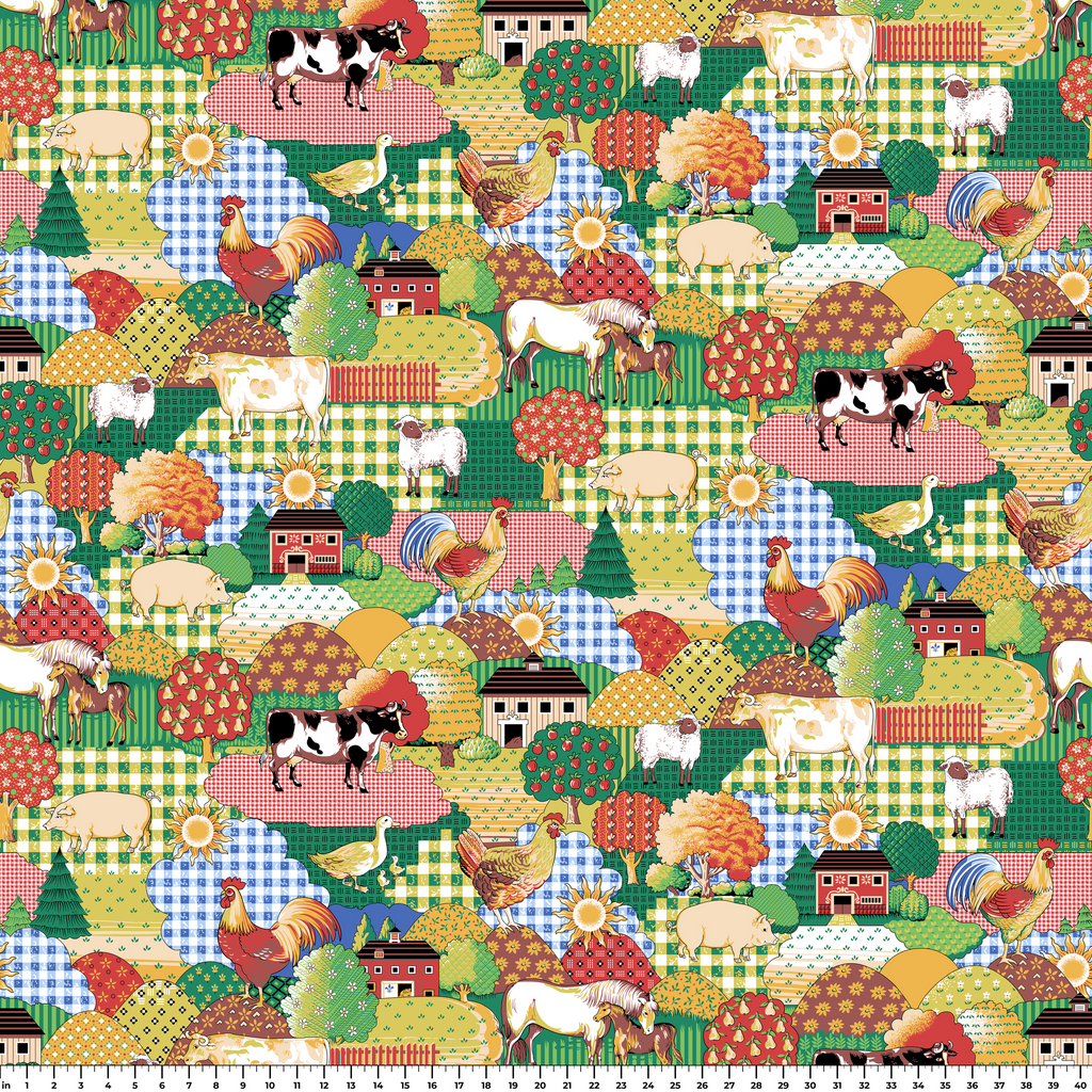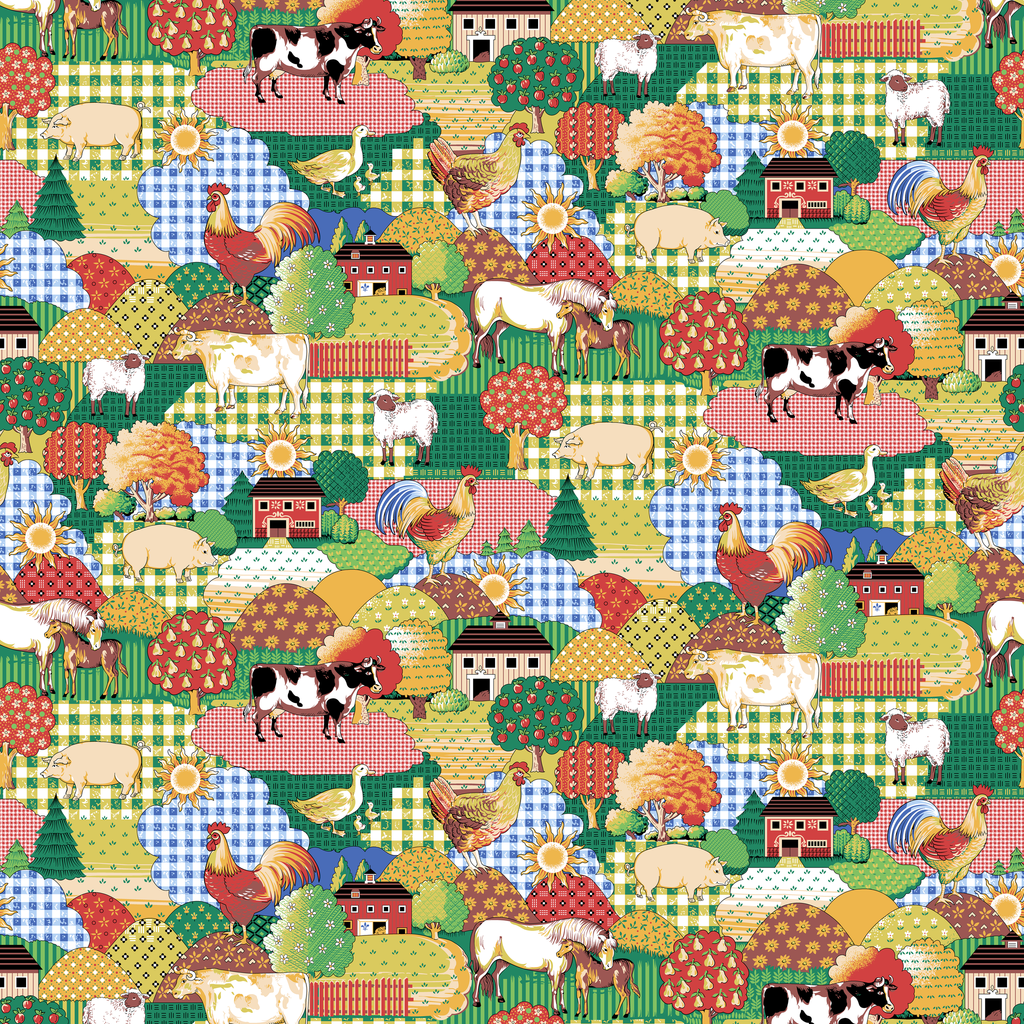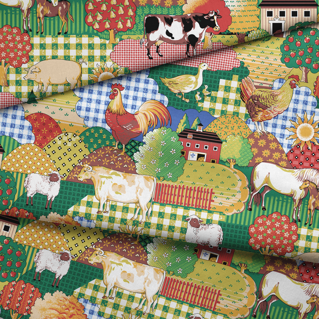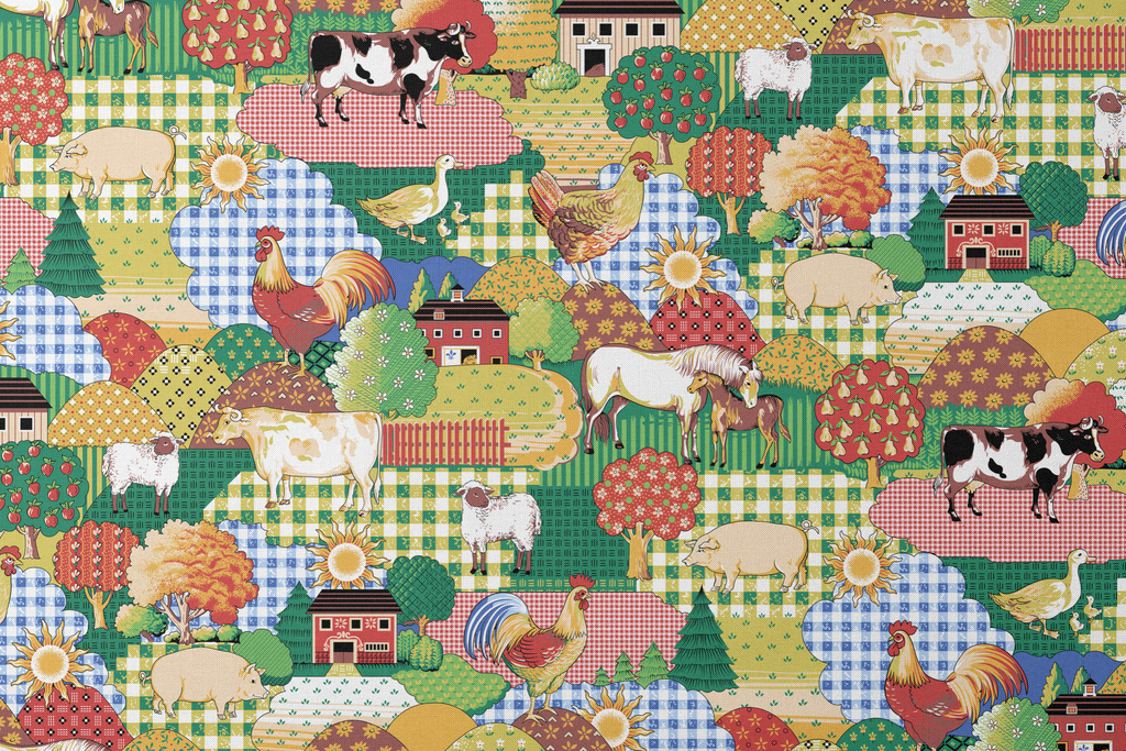 A maximalist countryside dreamscape featuring gingham hills, barnyard animals, and orchard trees. This print has a quilted charm all on its own-perfect for funky curtains, picnic quilts, or playful apparel with a nostalgic punch.