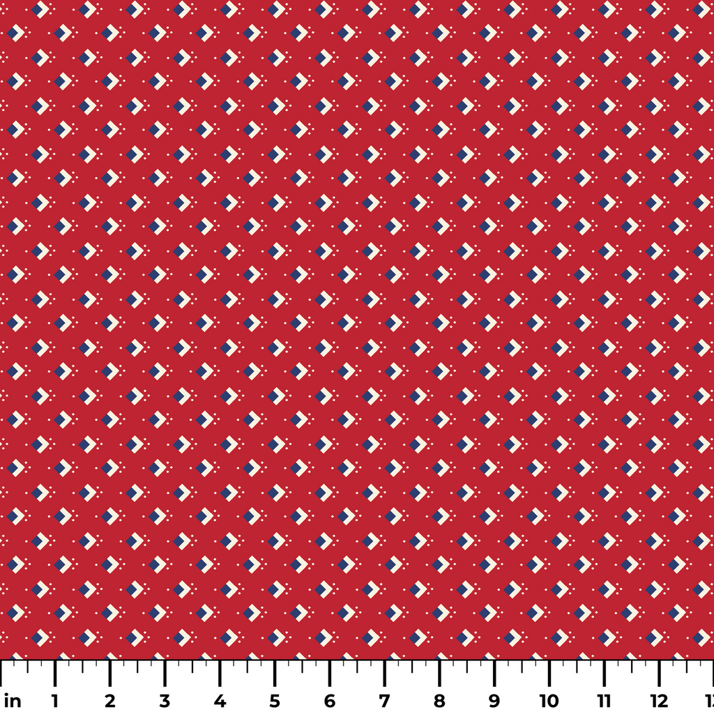 This vibrant pattern showcases geometric diamond shapes in navy blue and white against a rich crimson red background, creating a striking patriotic feel. Tiny white dots cluster around each diamond, adding a touch of whimsy and texture to the otherwise bold design. Perfect for summer quilting projects, table runners, or festive Fourth of July accessories that need that classic Americana touch.