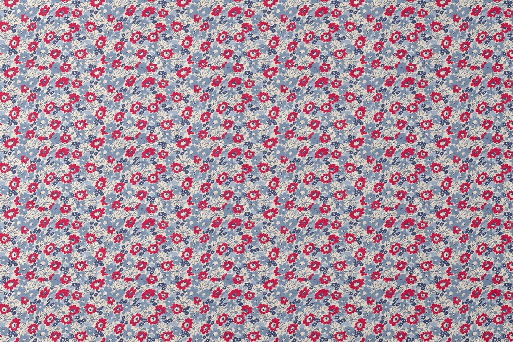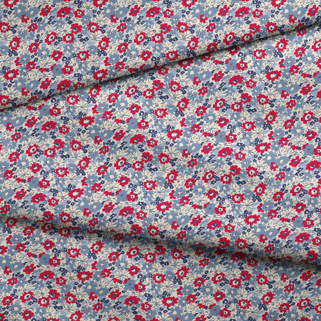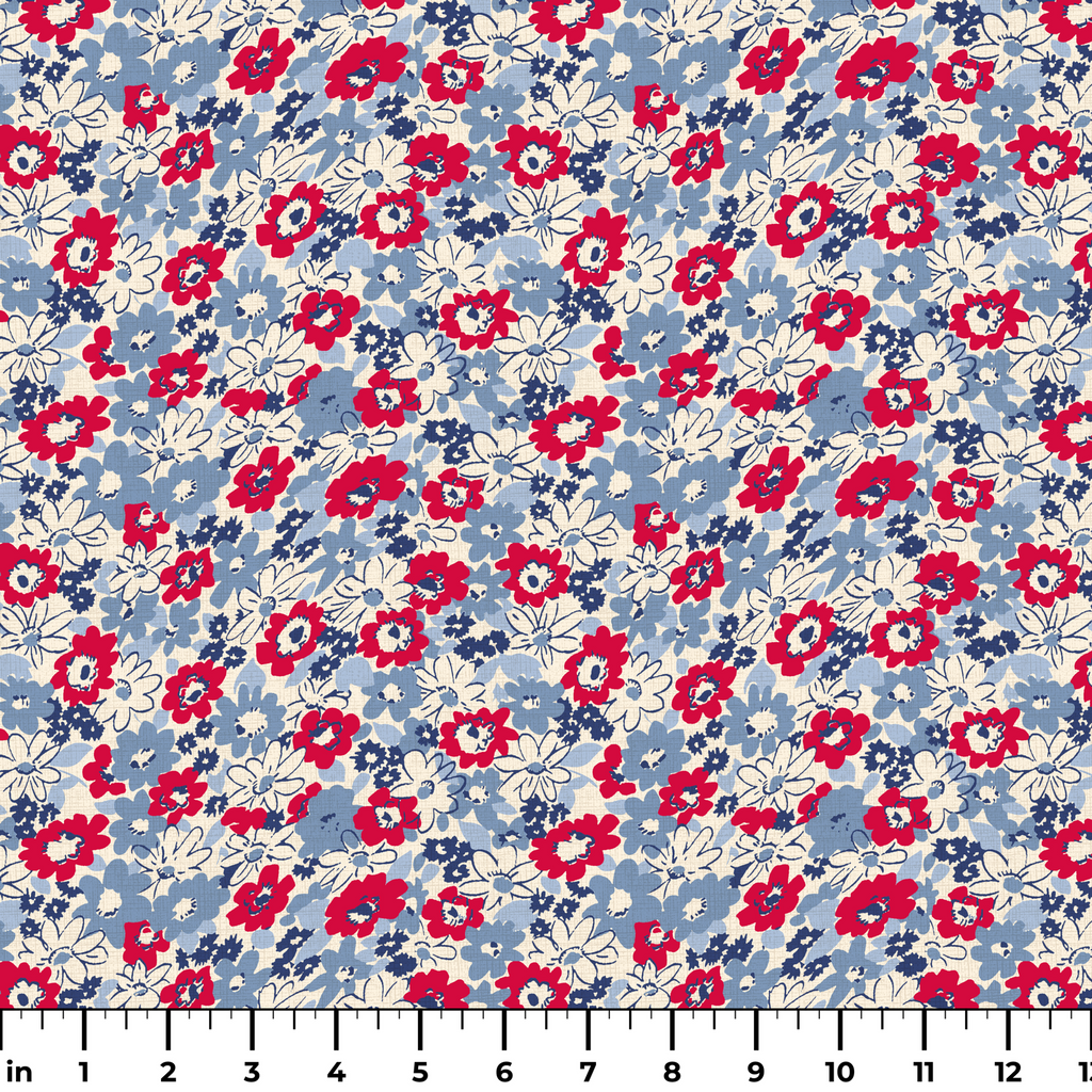This patriotic floral pattern dances with vibrant cherry red blossoms, powder blue petals, and navy accents against a natural cream background. The hand-sketched flower outlines give it a breezy, artistic quality that feels both vintage and fresh. Perfect for summer tote bags, quilting projects, or festive table runners that will brighten up your Fourth of July gatherings or add a touch of Americana to your home year-round.