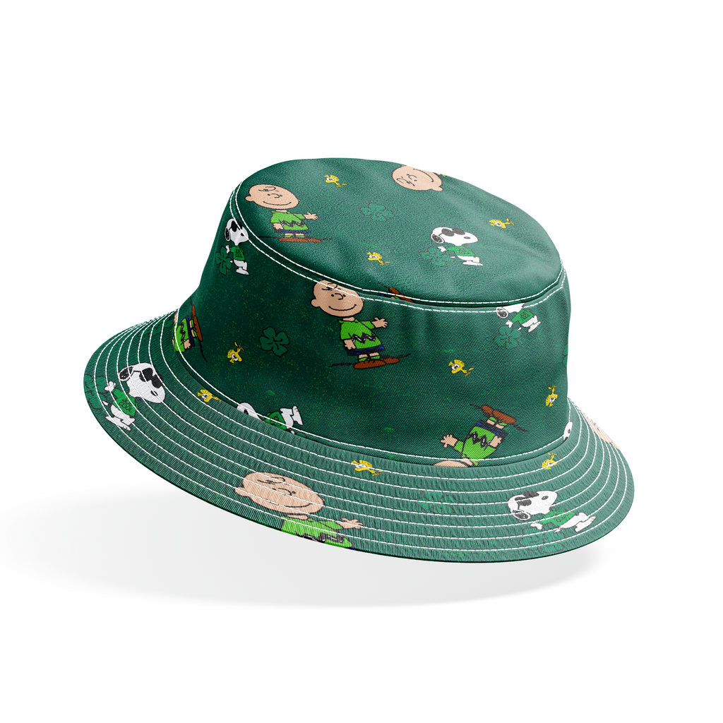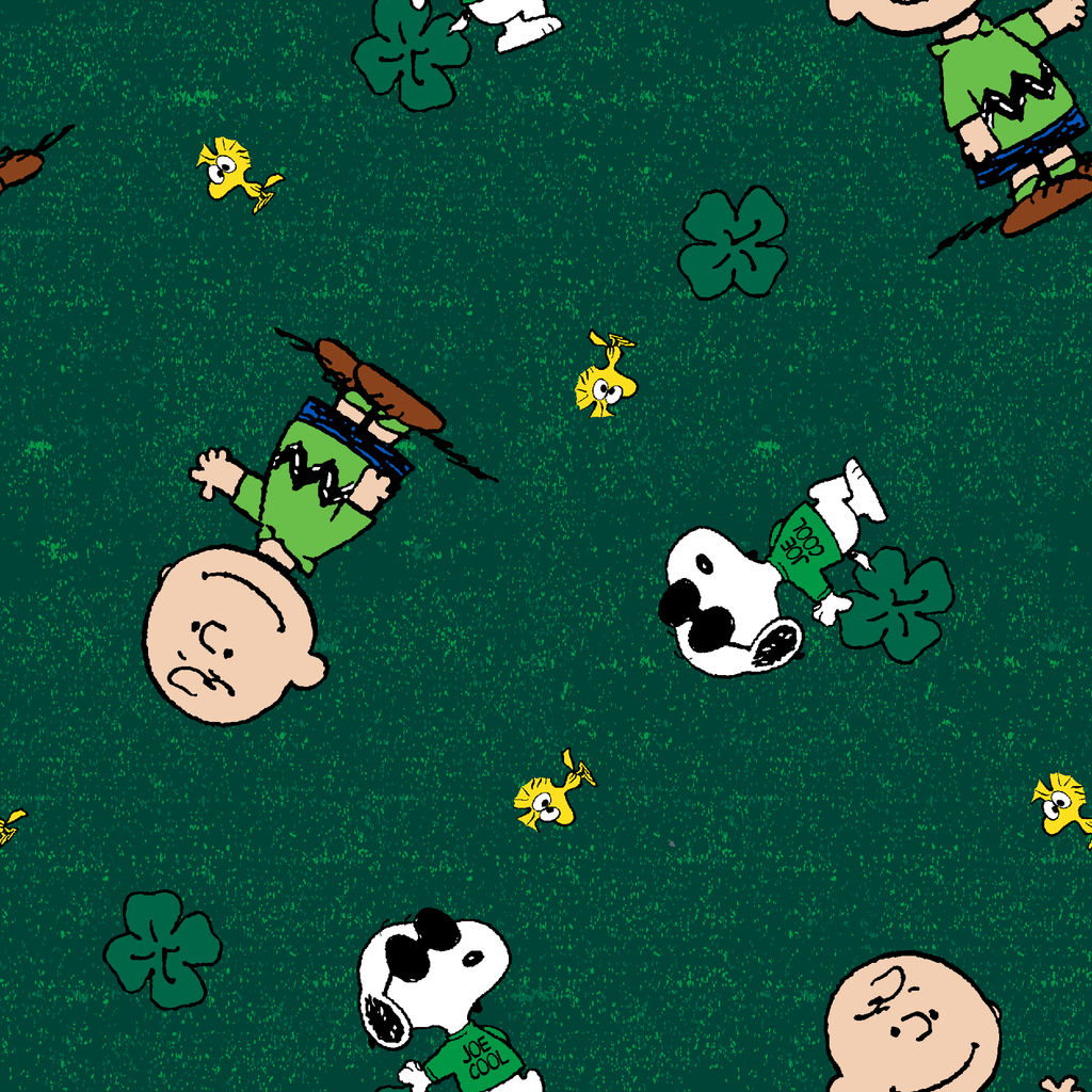 Peanuts Charlie Brown, Snoopy and Woodstock with four-leaf clovers tossed around in green. Perfect for St. Patrick's Day celebrations or fans of classic animated comics.