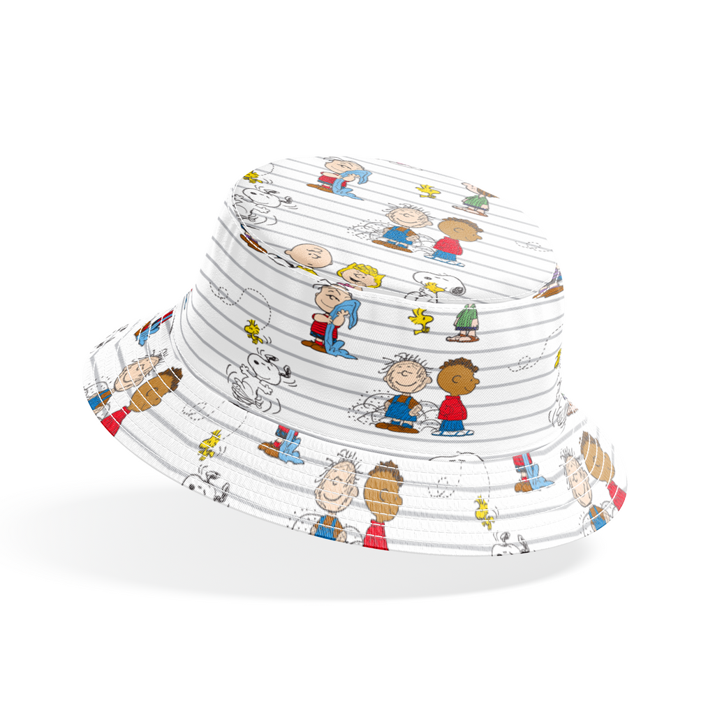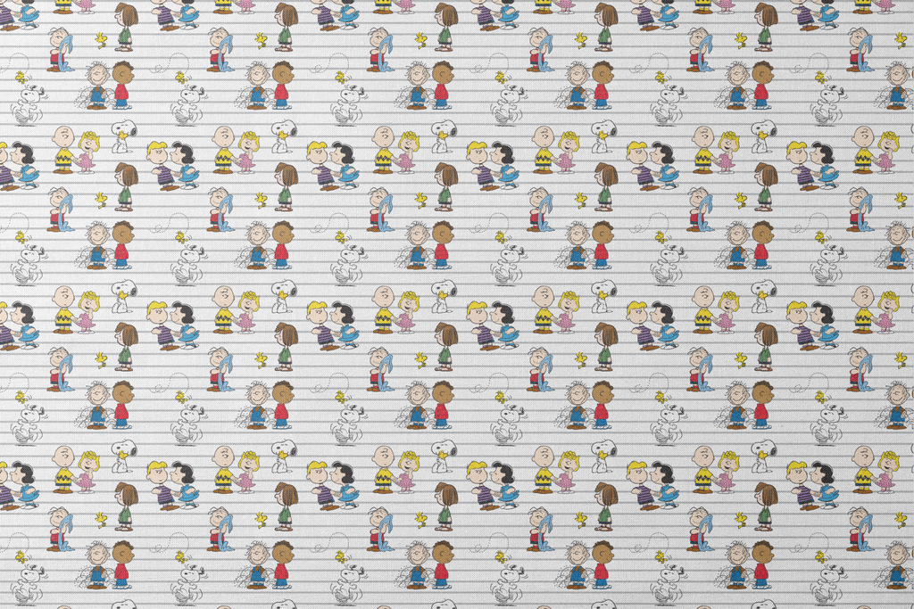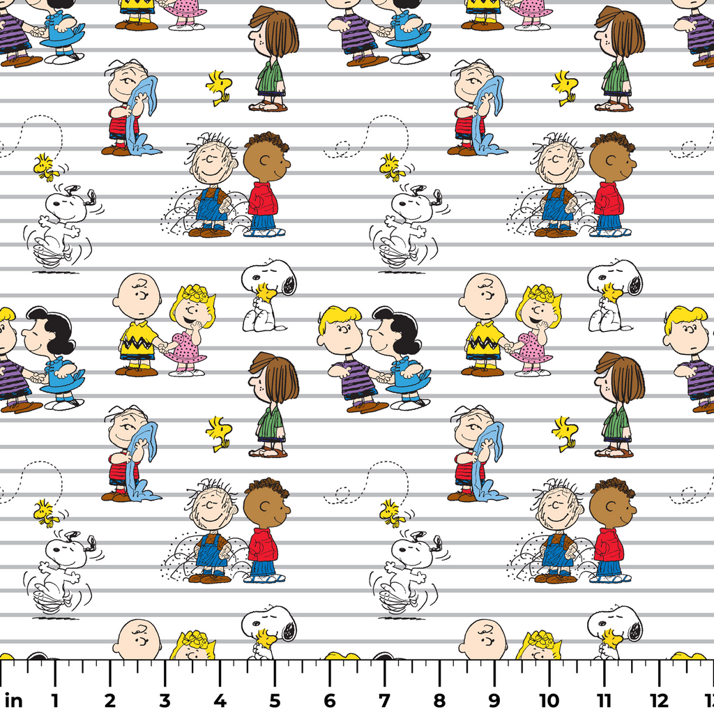 Vintage cartoon fabric featuring Peanuts characters on white stripes. Charlie Brown, Snoopy, and friends in playful scenes make this perfect for quilting, children's apparel, or nostalgic home decor.