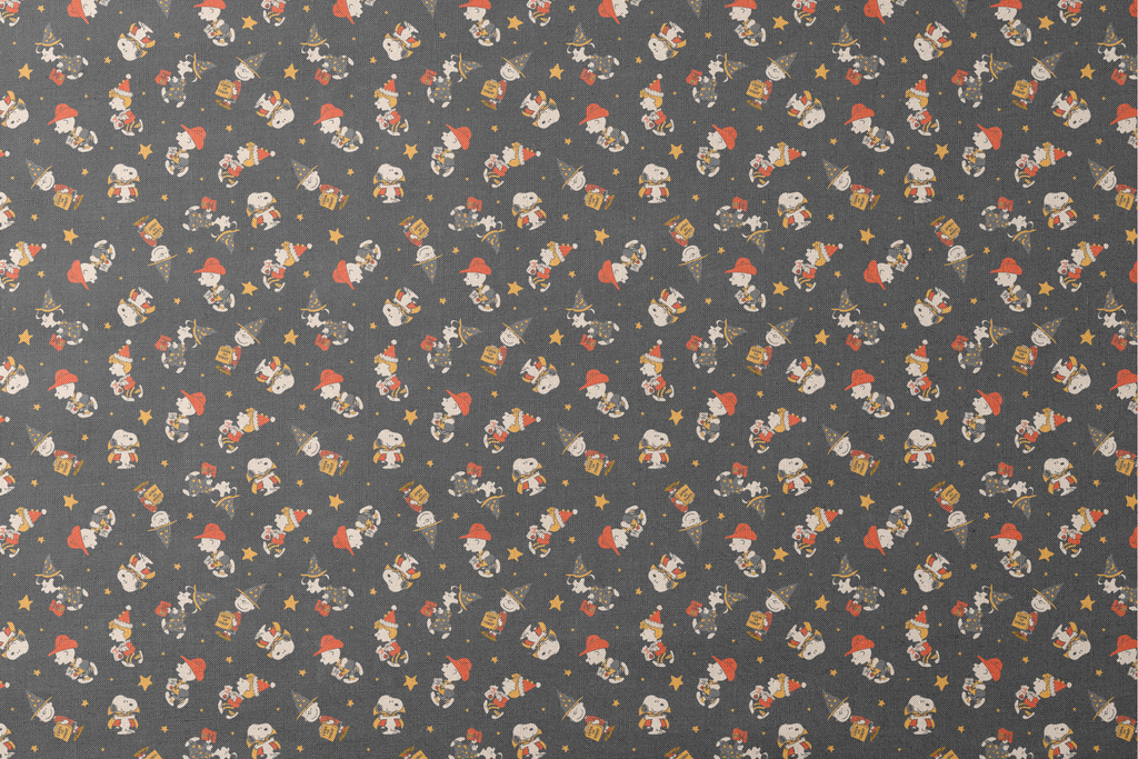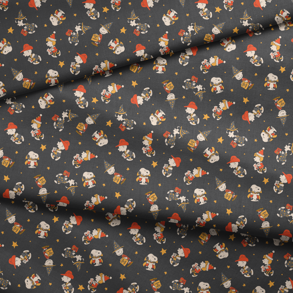 Adorable Peanuts characters in Halloween costumes scattered across a dark gray background with golden stars. Festive holiday pattern perfect for seasonal apparel or cozy home decor.