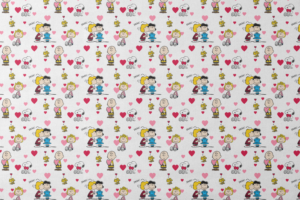Celebrate love with this adorable Peanuts cartoon pattern featuring Snoopy, Charlie Brown, and friends surrounded by pink and red hearts on a white background.