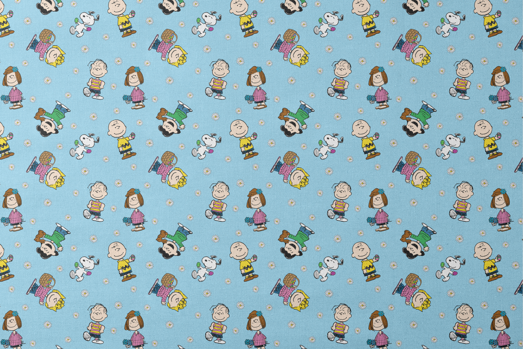 Adorable Peanuts cartoon characters scatter on a light blue background with white daisies. Features Snoopy, Charlie Brown and friends in classic retro style perfect for kids' apparel or bedding.