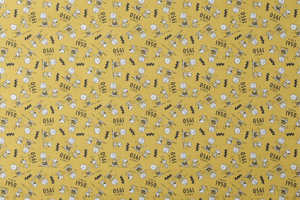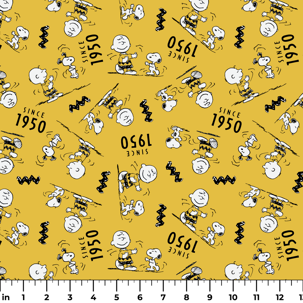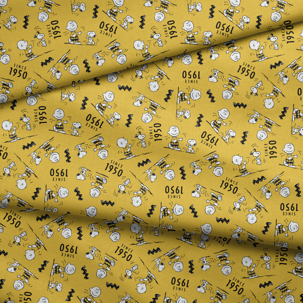 Classic Peanuts pattern featuring Snoopy and Charlie Brown dancing on a mustard yellow background. Vintage comic-inspired design celebrating this beloved cartoon series since 1950.