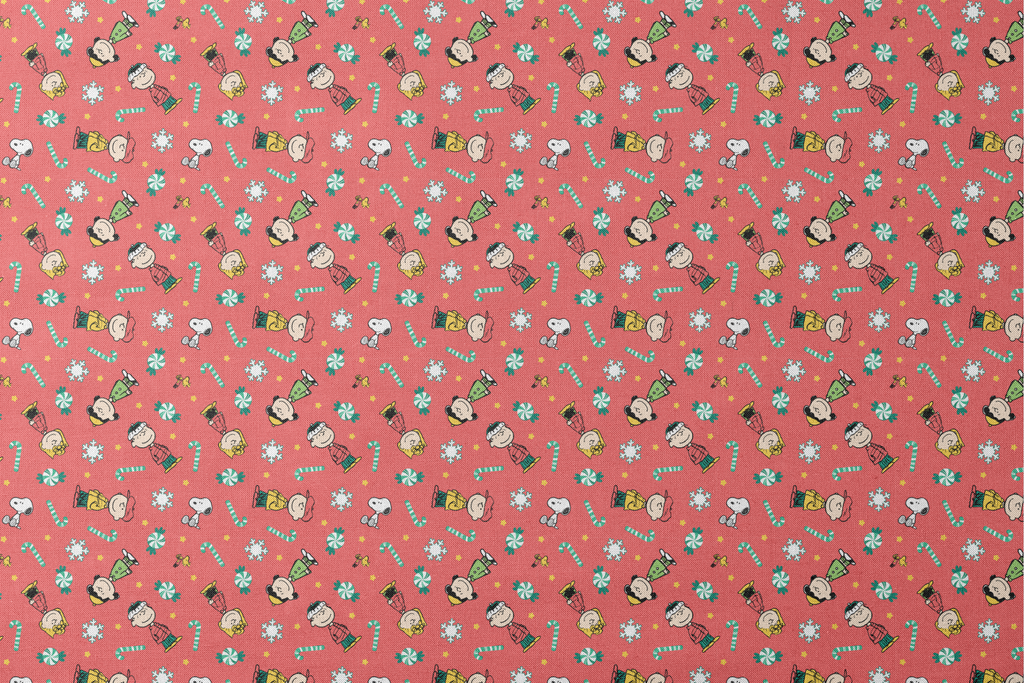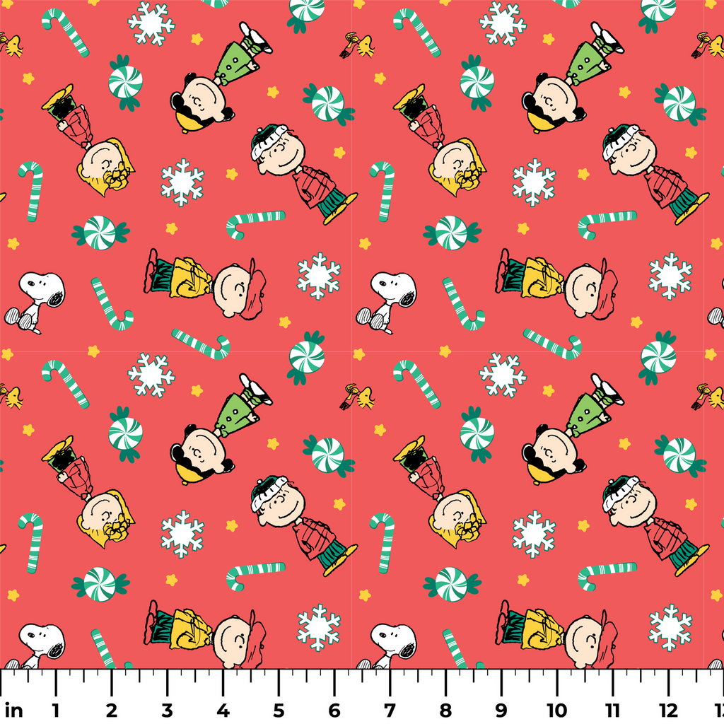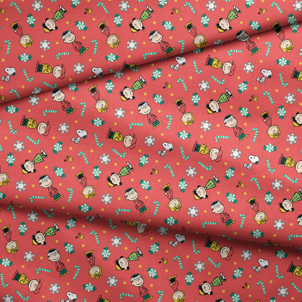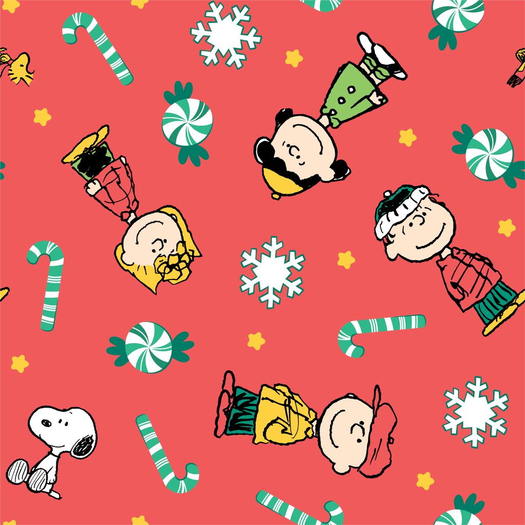 Festive Peanuts holiday pattern featuring Snoopy, Charlie Brown and friends on a vibrant red background with candy canes, peppermints, and snowflakes - perfect for Christmas crafting and decor.