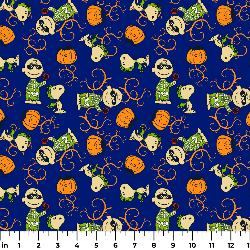This spooky fabric features Snoopy & Charlie Brown in Halloween costumes with pumpkins and orange vines on a blue background - perfect for seasonal crafts and children's holiday apparel.