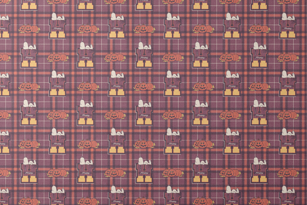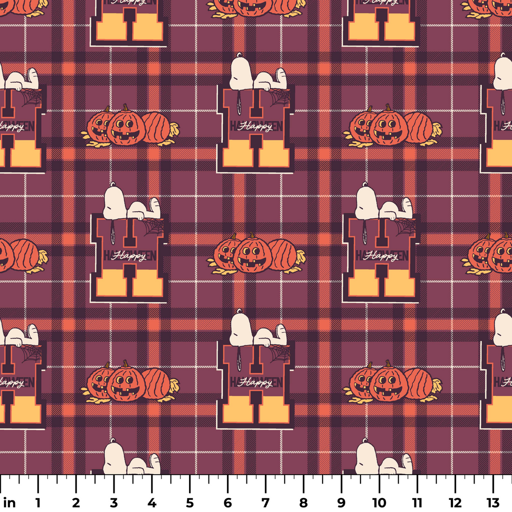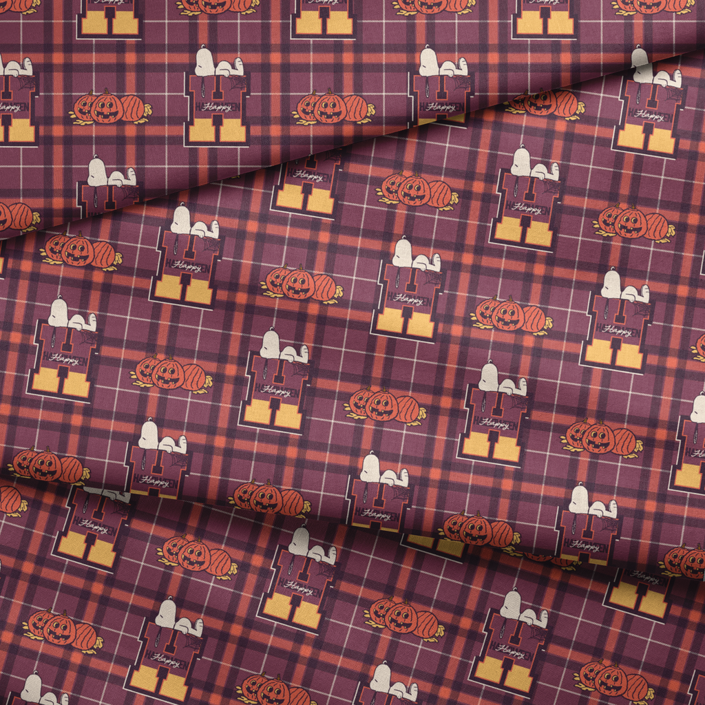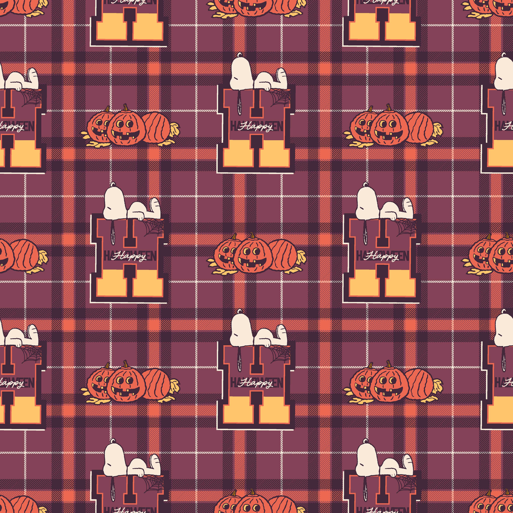 Cozy fall plaid pattern featuring Snoopy and pumpkins in orange and burgundy tones. Perfect for Halloween with vintage Peanuts charm!