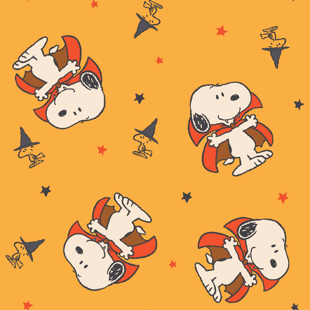 Classic Peanuts Snoopy pattern on a vibrant yellow background featuring the beloved beagle in a vampire costume with Woodstock scattered throughout - perfect for fans of this iconic comic character.