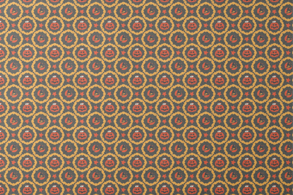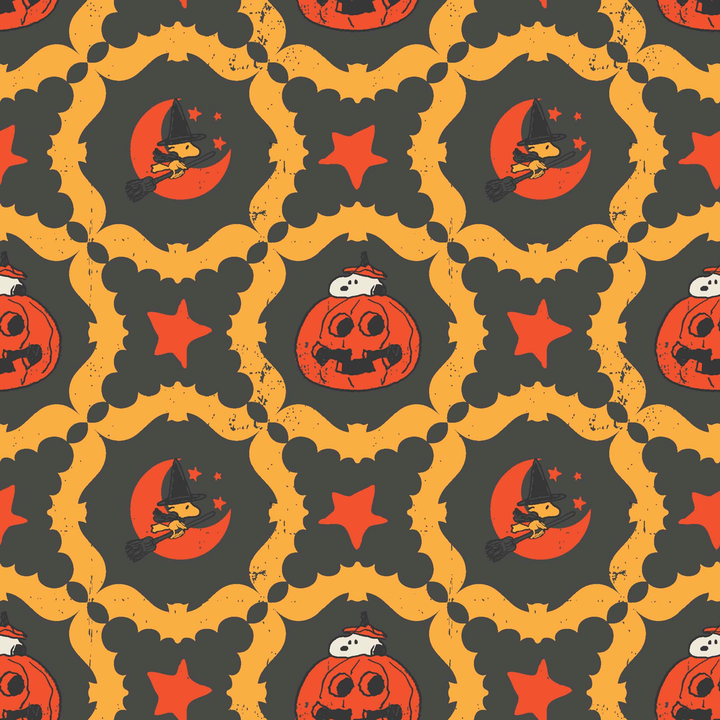 Vintage Peanuts Halloween pattern featuring spooky pumpkins, crescent moons, and Snoopy & Woodstock in a retro geometric layout with yellow scalloped frames on a dark gray background.