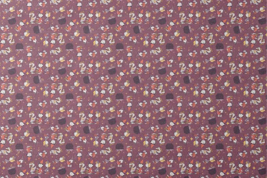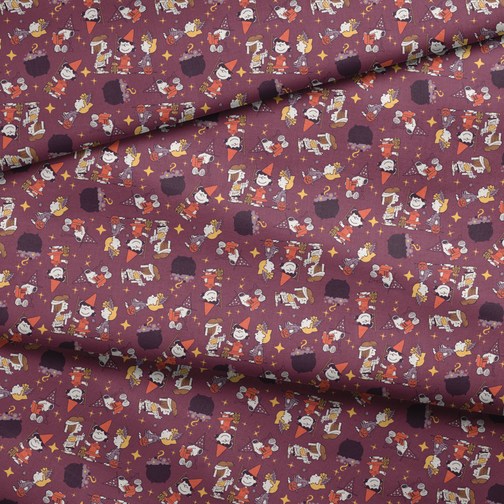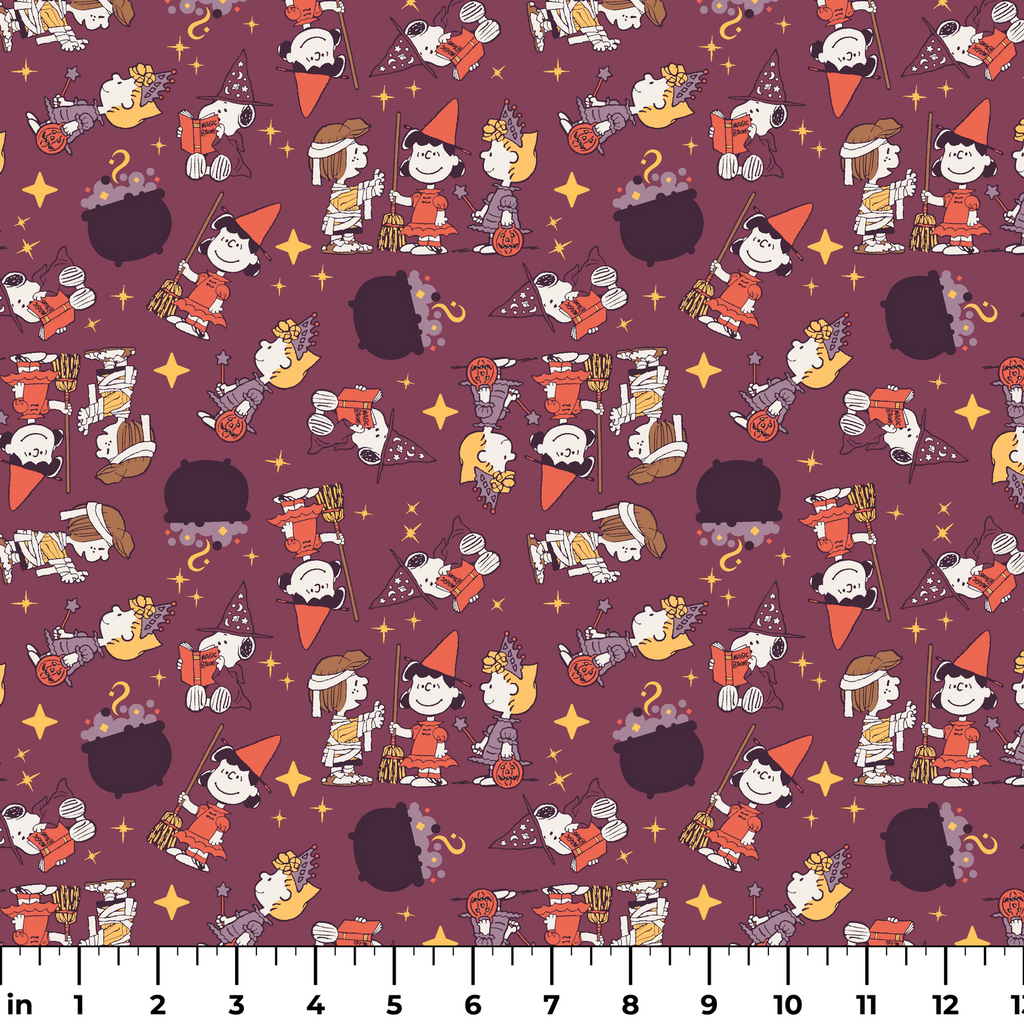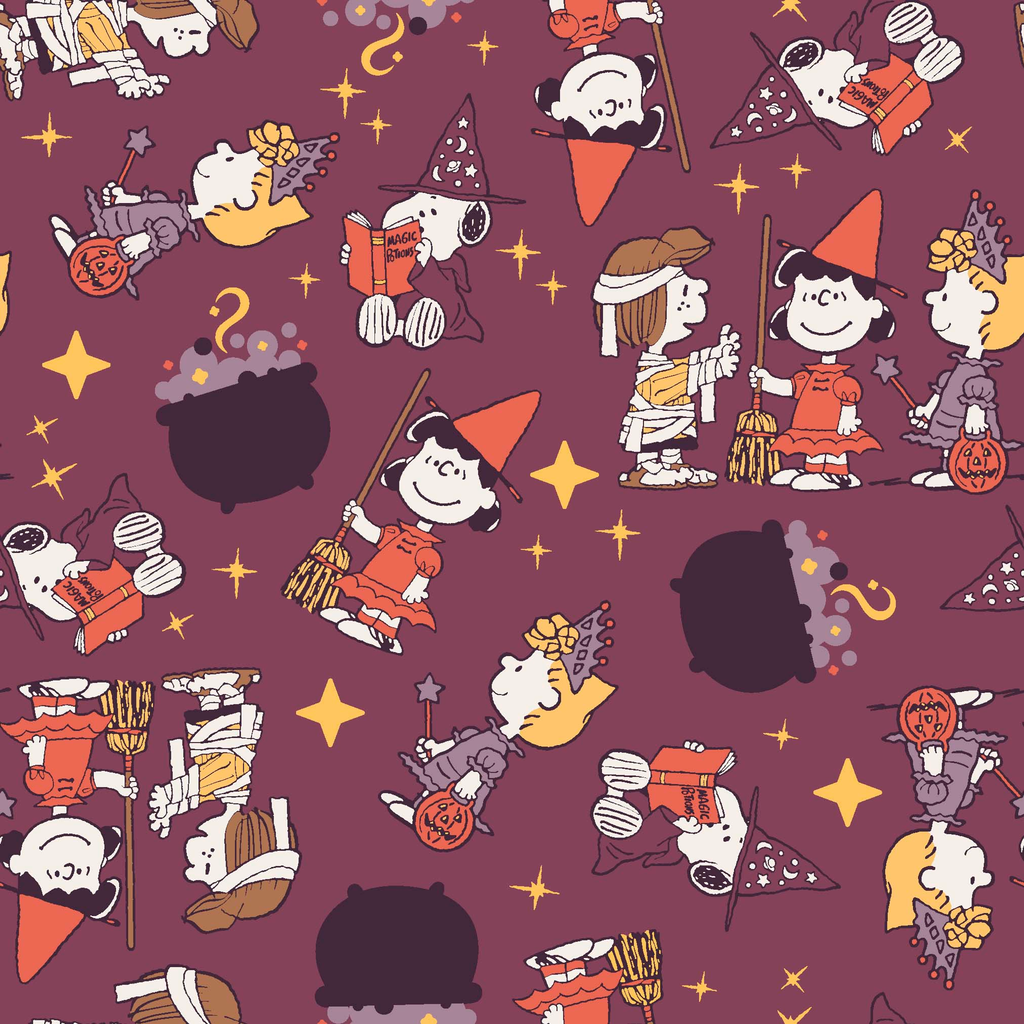 Enchanting retro pattern featuring Peanuts characters in magical Halloween costumes with witches hats, broomsticks, and cauldrons on a starry purple background. Ideal for fun holiday projects for gifts or your own home.