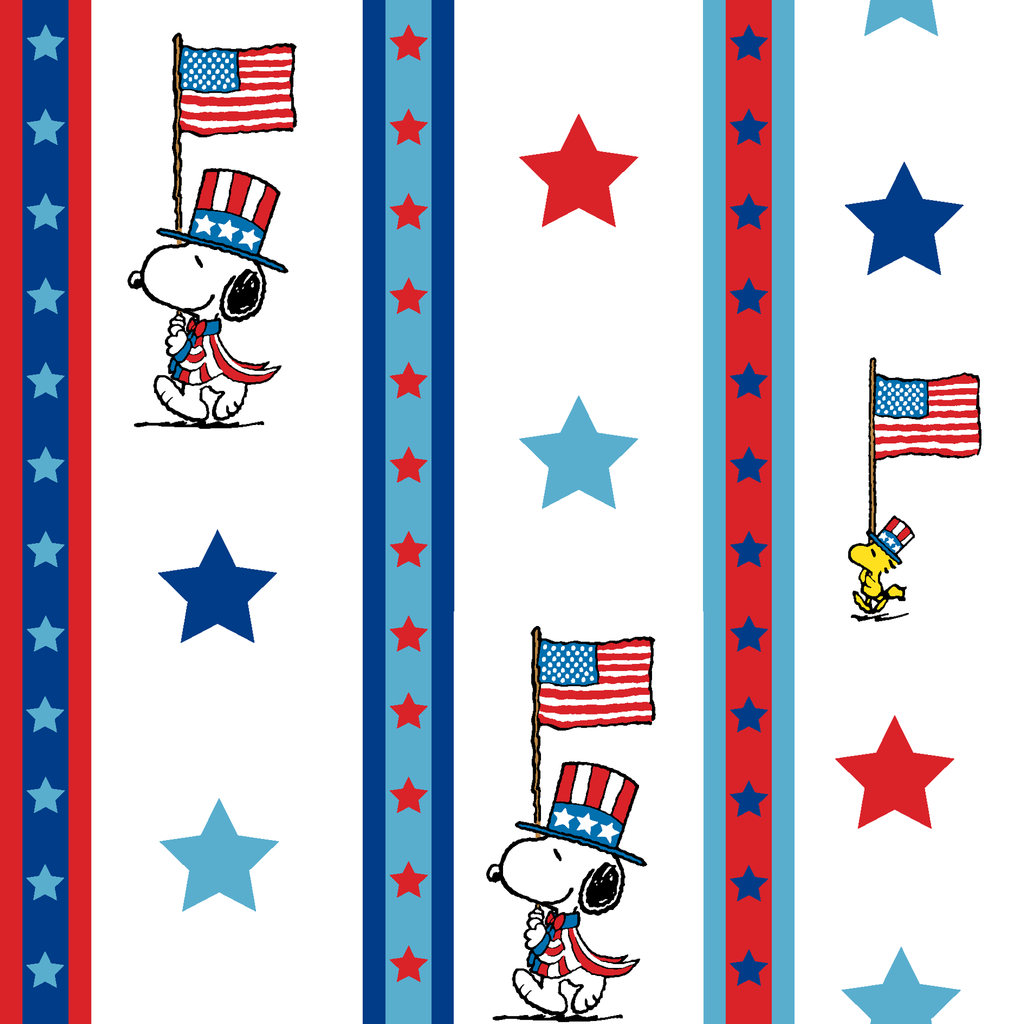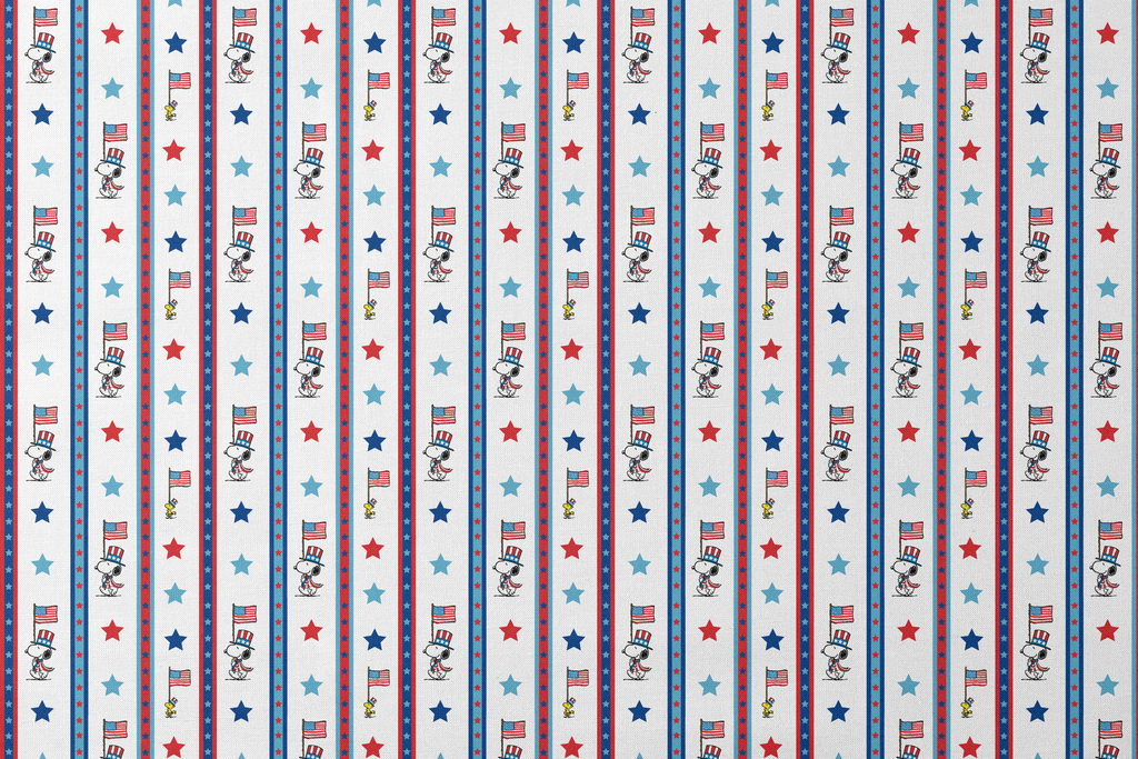 Celebrate patriotic style with this charming Peanuts Snoopy and Woodstock pattern with American flags, stars, and red, white and blue stripes. Perfect for 4th of July decor or crafting projects.