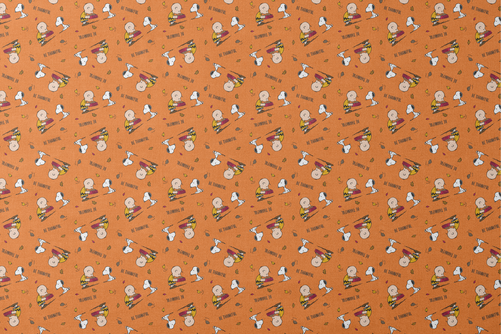 Celebrate Thanksgiving with this adorable Peanuts-inspired fabric featuring Snoopy and Charlie Brown among autumn leaves on a vibrant orange background. Perfect for holiday decorating and crafts!
