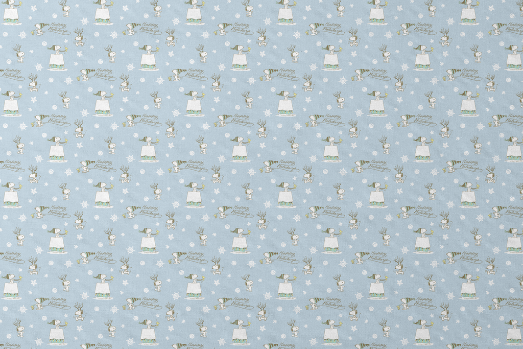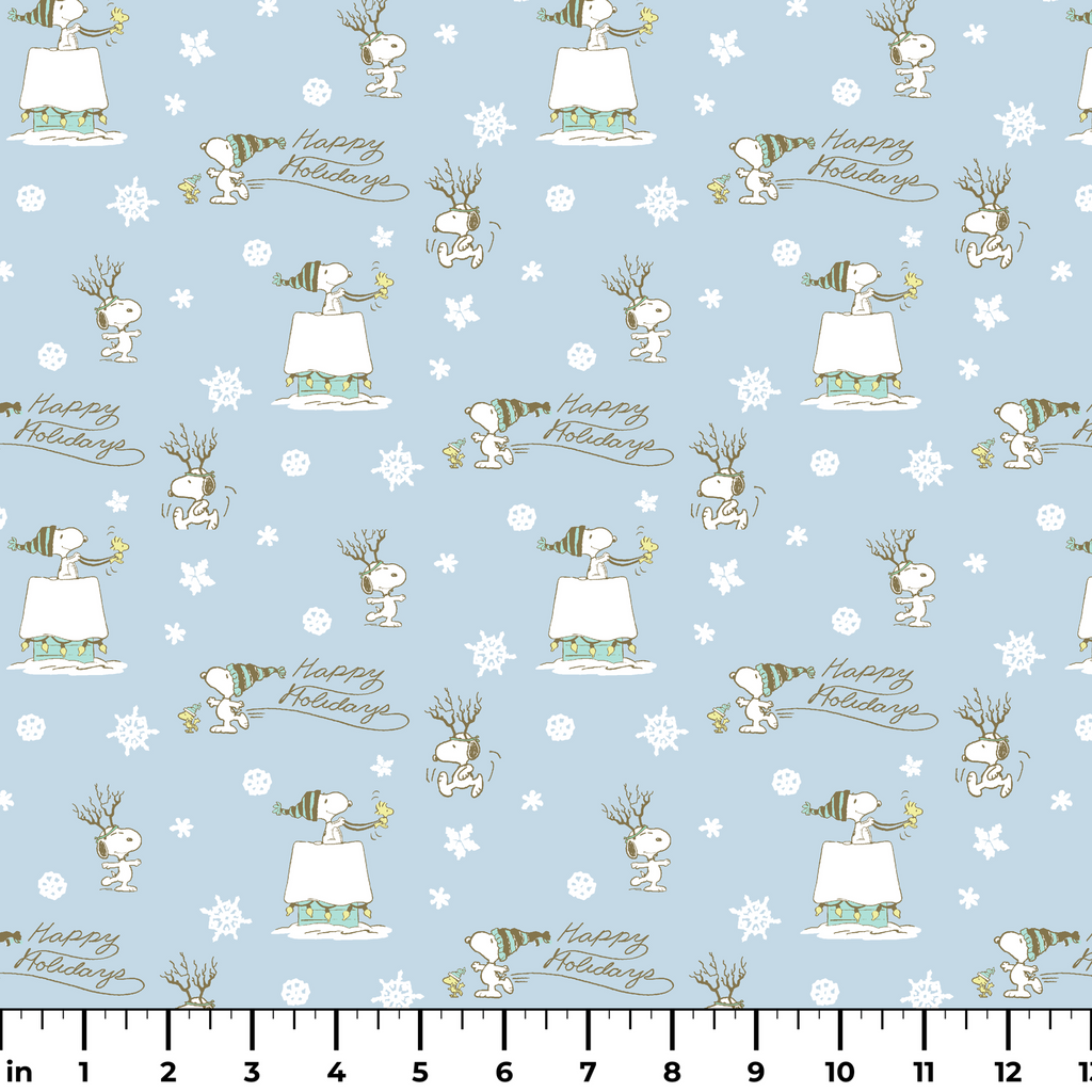 This festive blue winter toss features Peanuts Snoopy and Woodstock in various poses - on his doghouse, wearing antlers, and holding a "Happy Holidays" banner - surrounded by delicate snowflakes for a cheerful seasonal look. Perfect for holiday decor or crafting projects.
