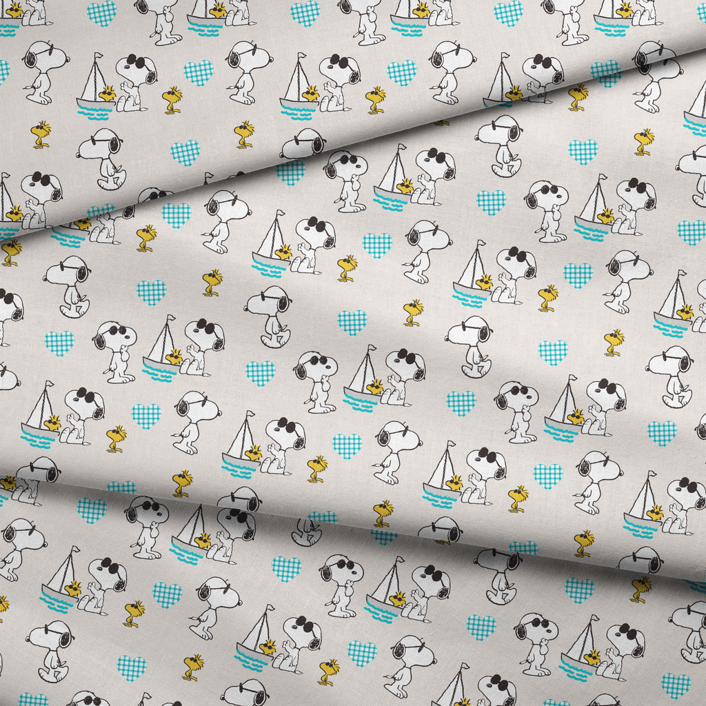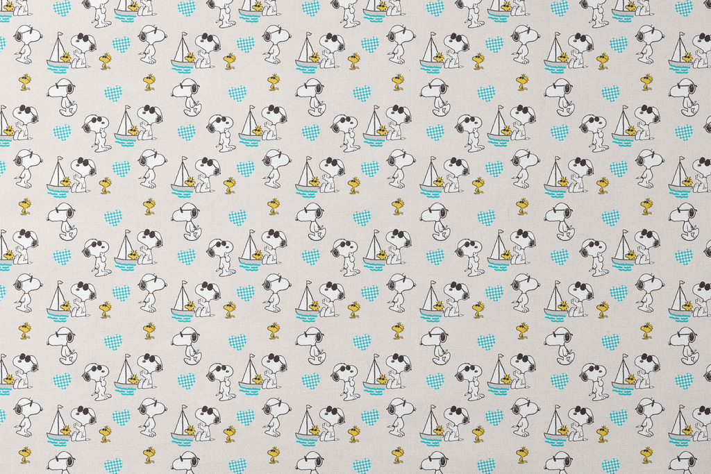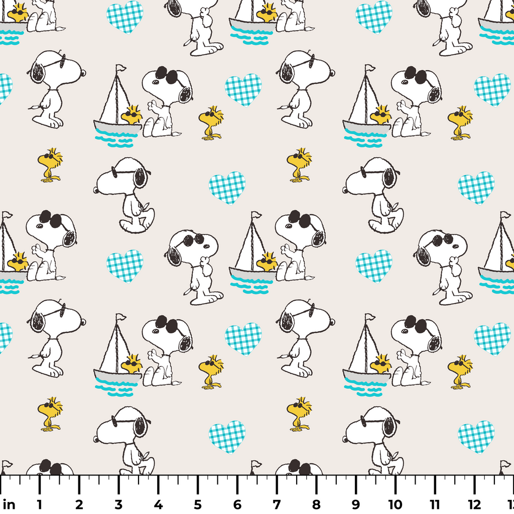 Adorable Peanuts Snoopy and Woodstock in various playful poses with sailboats, gingham hearts and waves on a cream background. Perfect for beach decor or kids projects.