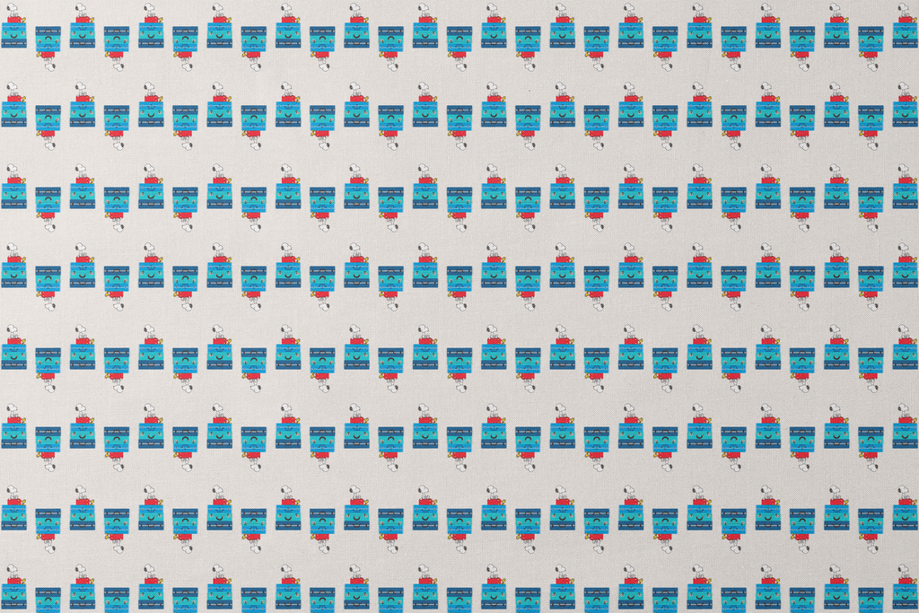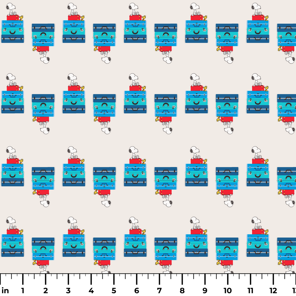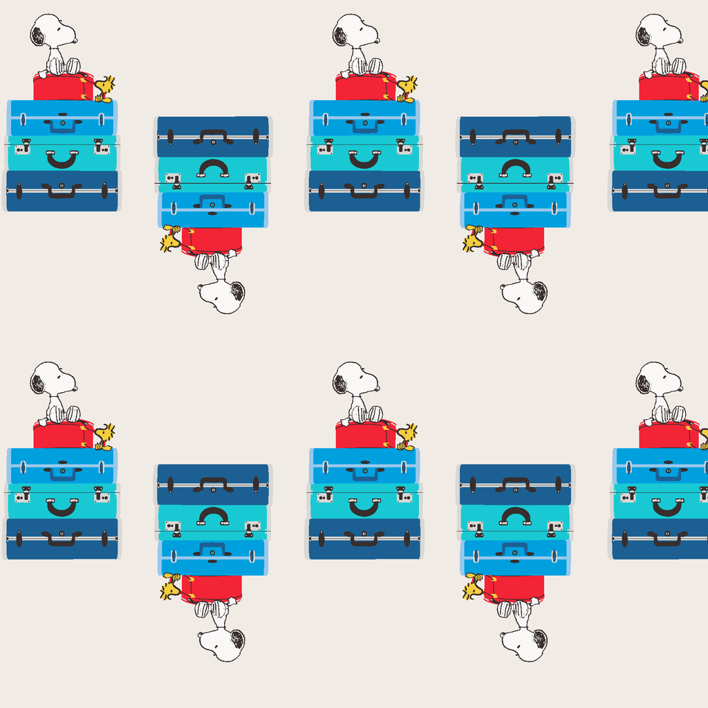 Adorable Peanuts Snoopy and Woodstock pattern featuring the iconic duo sitting on colorful luggage and ready for their next adventure. Perfect for Peanuts fans who love travel.
