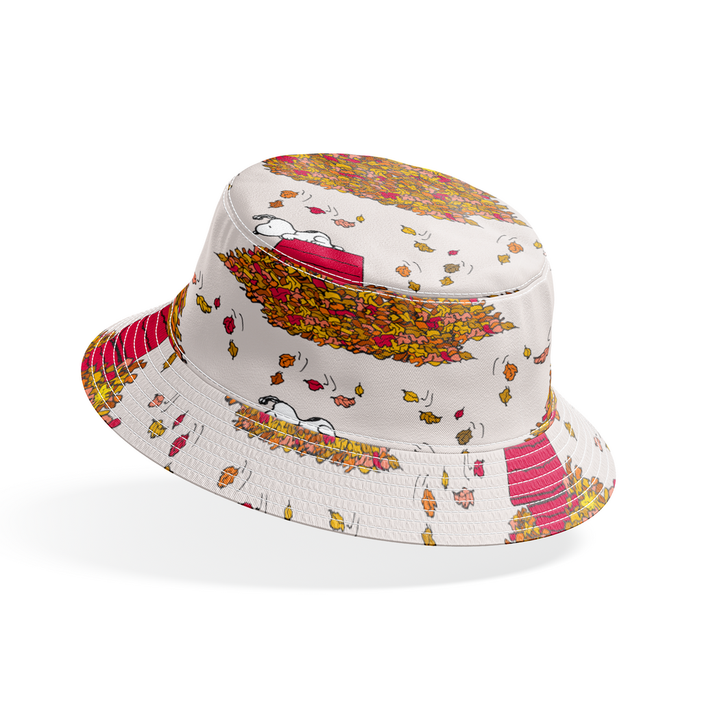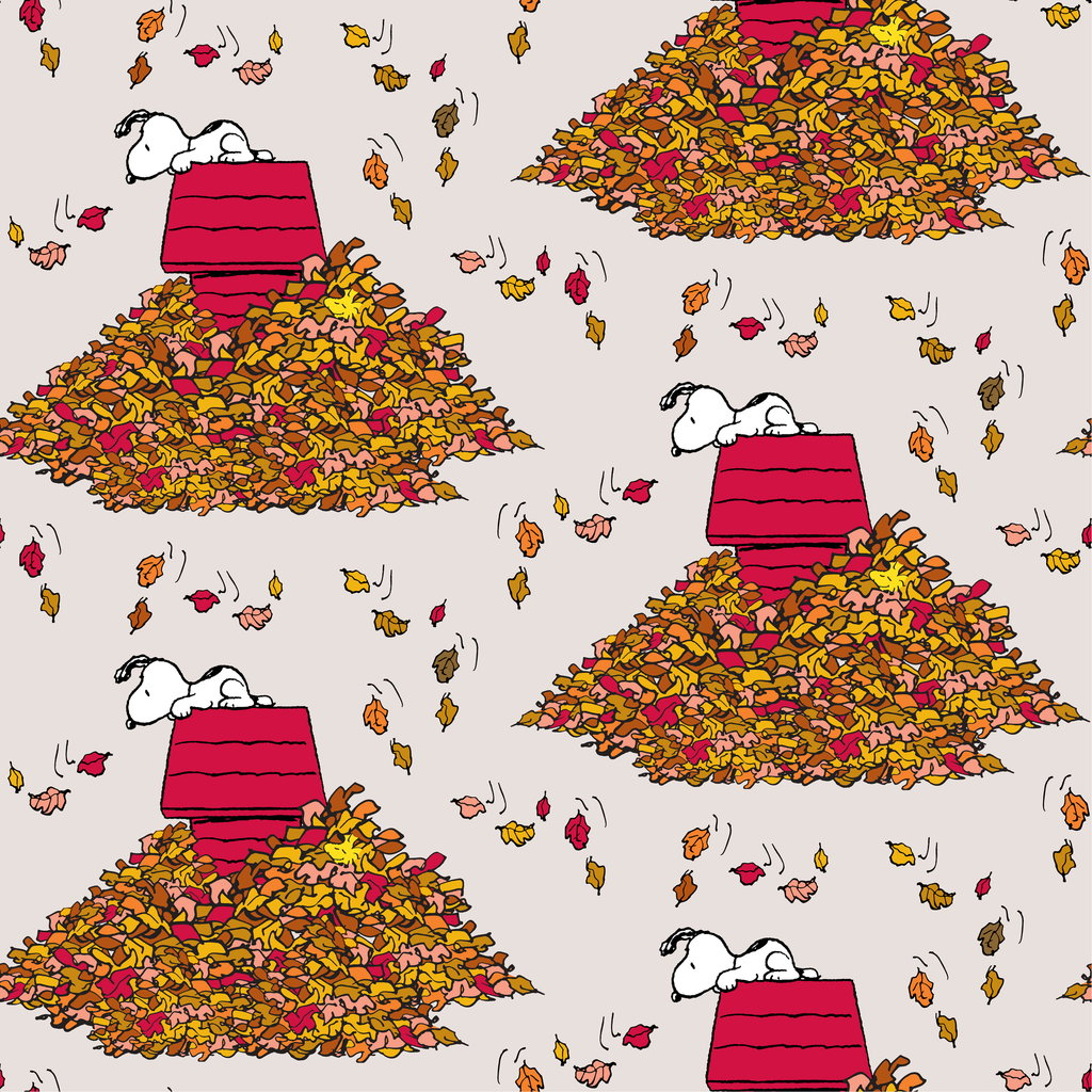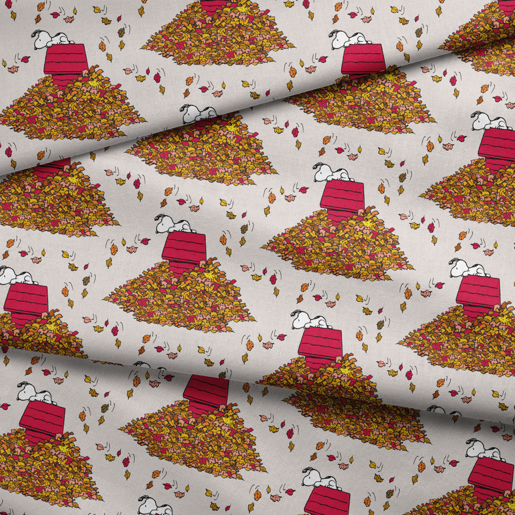 Snoopy on his iconic red doghouse surrounded by vibrant piles of colorful autumn leaves. Perfect for fall decor with this charming Peanuts character celebrating the season.