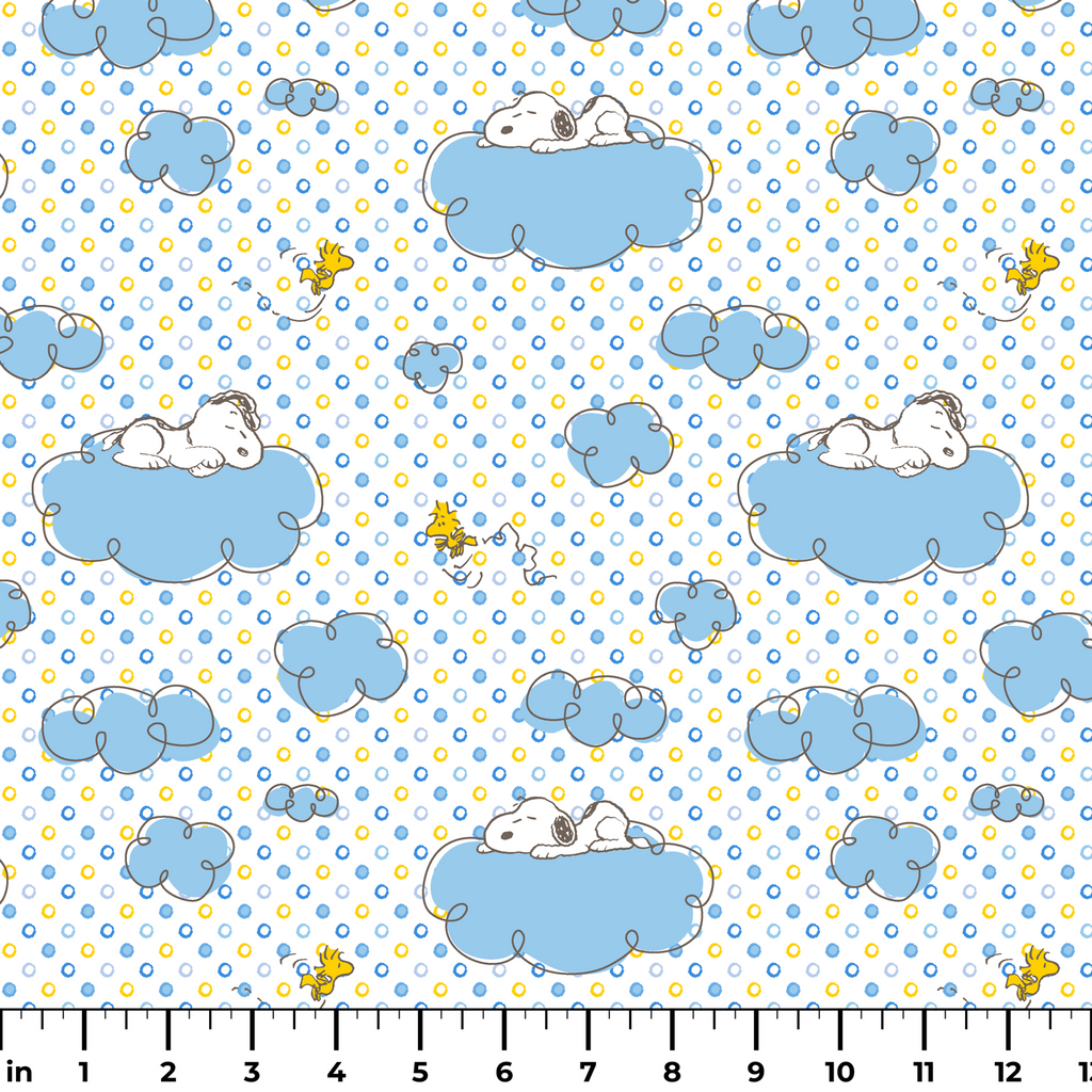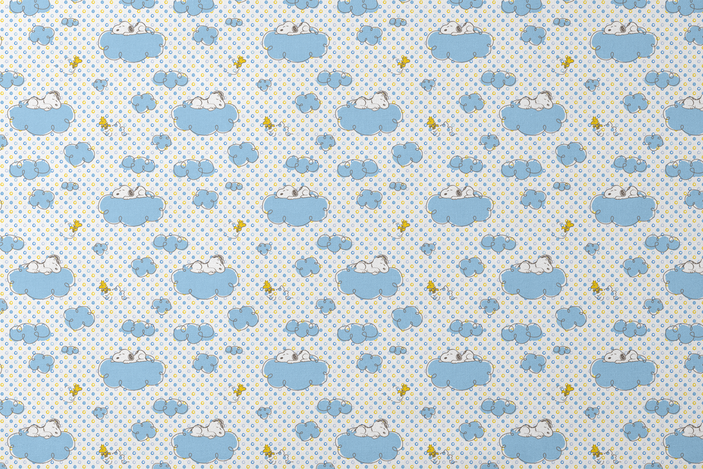 Sweet Peanuts Snoopy pattern featuring the beloved icon sleeping on soft blue clouds with little Woodstock birds, set against a polka dot background. Perfect for nursery decor or crafting projects.