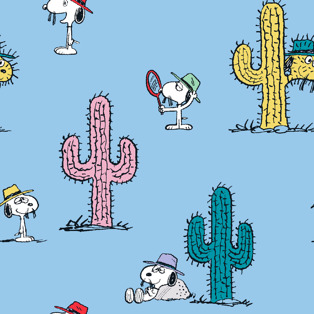Adorable Peanuts Snoopy pattern featuring the beloved icon exploring colorful cacti with different poses on a light blue background - perfect for fans of classic Peanuts cartoons and southwestern charm.