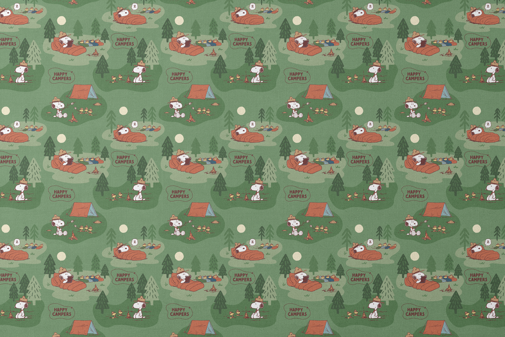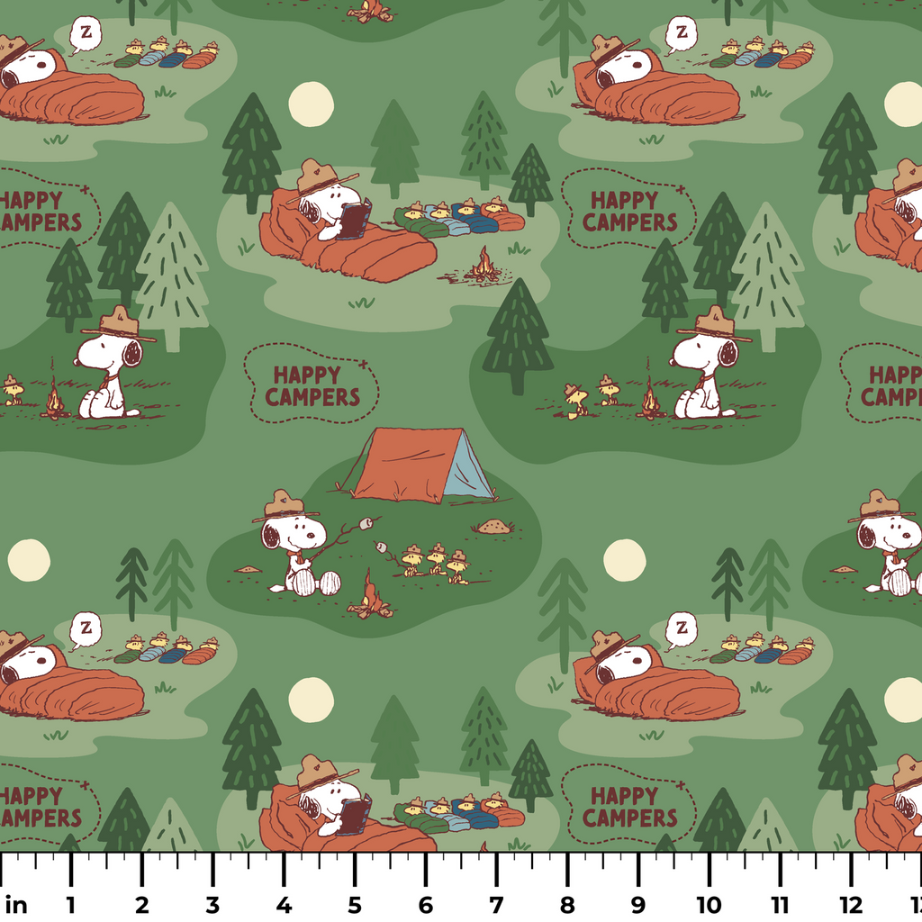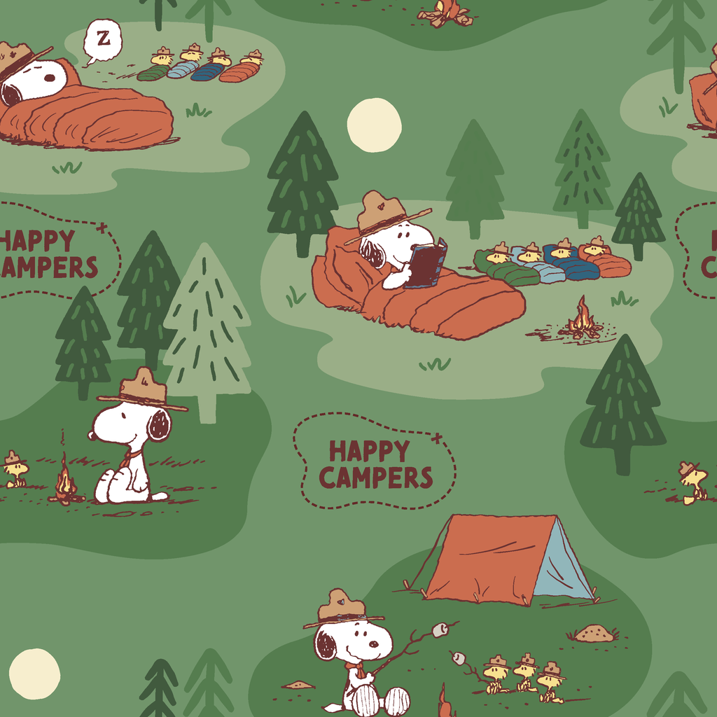 Peanuts Snoopy Camping Adventure on Green Fabric