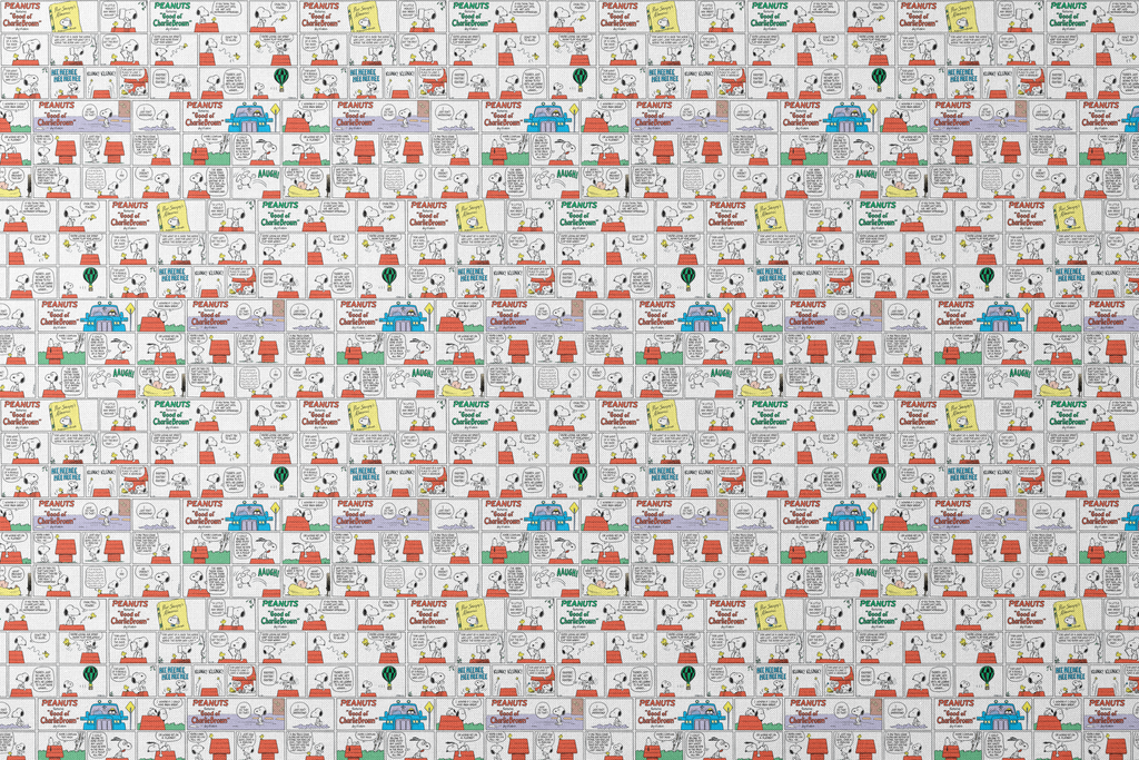 This classic Peanuts comic strip collage features the beloved Snoopy on his red doghouse, Woodstock and other charming comic panels. Perfect for fans of the iconic comic.