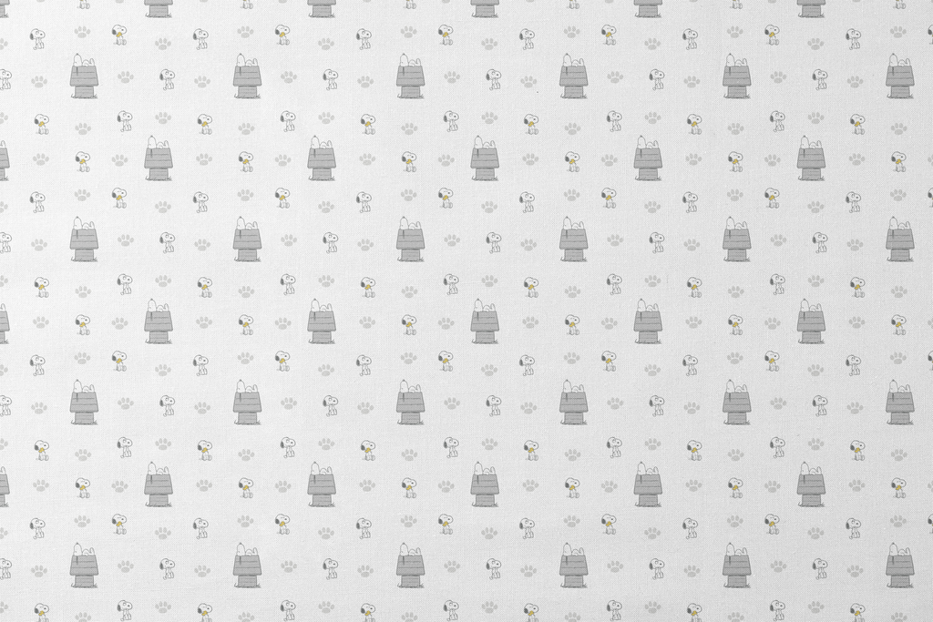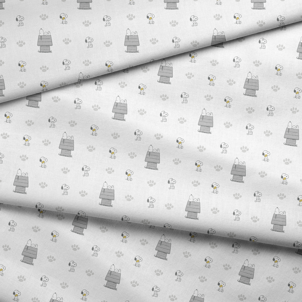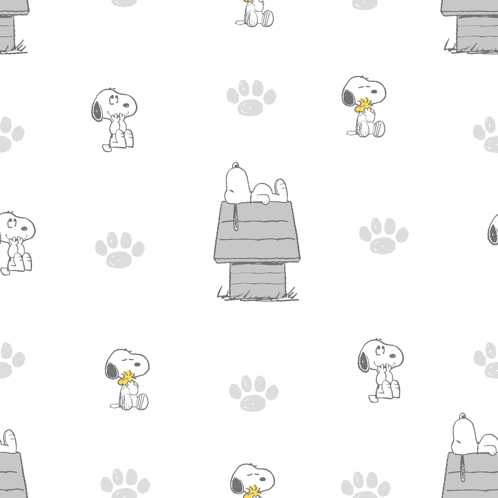 Adorable Peanuts pattern featuring Snoopy lounging atop his doghouse, with playful paw prints scattered throughout. Perfect for crafting projects and nursery decor.
