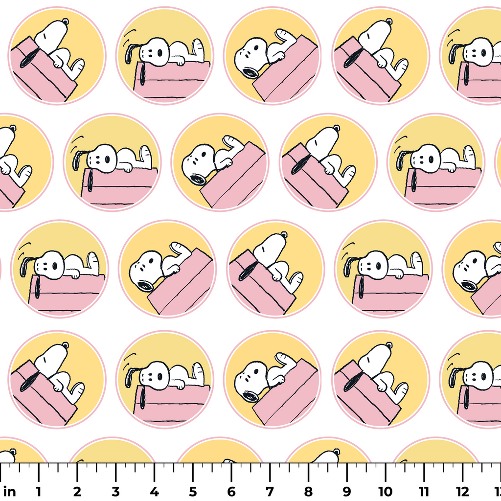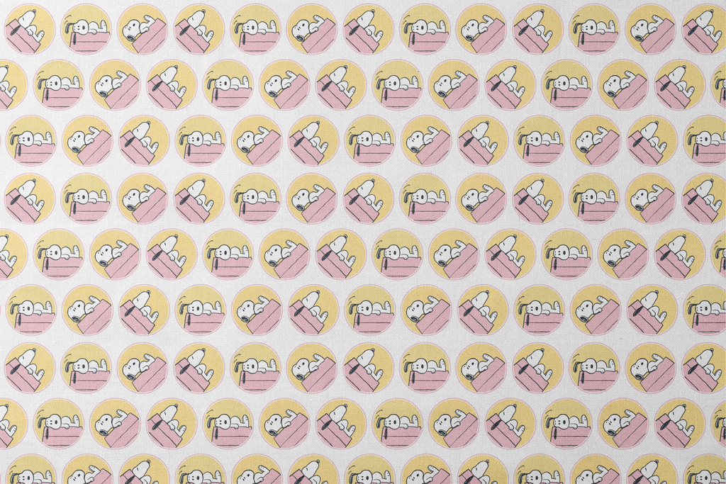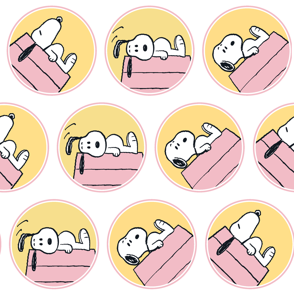 Adorable Snoopy pattern in pastel pink and yellow featuring various sleeping poses. Classic animated character design with nostalgic appeal for pet lovers and Peanuts fans alike.