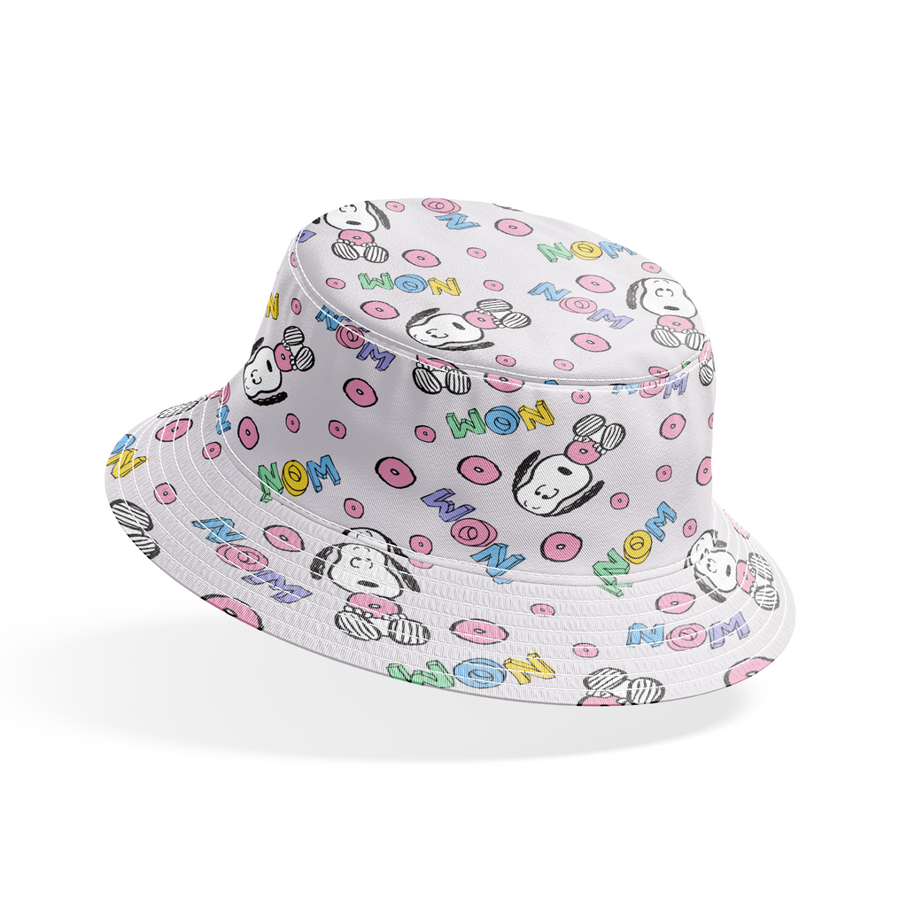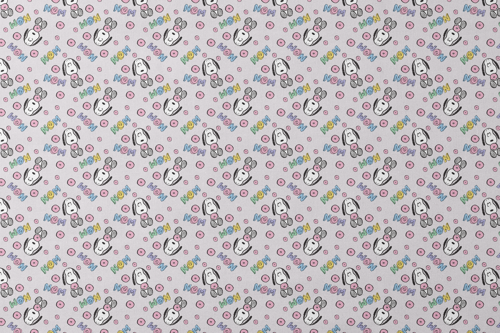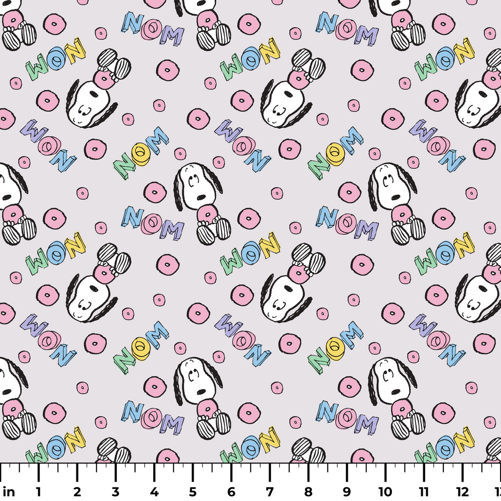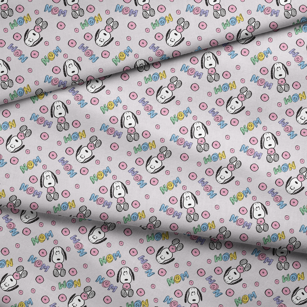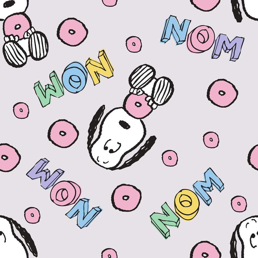 Adorable Peanuts Snoopy pattern with pink donuts and colorful "NOM" text on a playful pastel background - perfect for Peanuts fans and sweet treat enthusiasts!