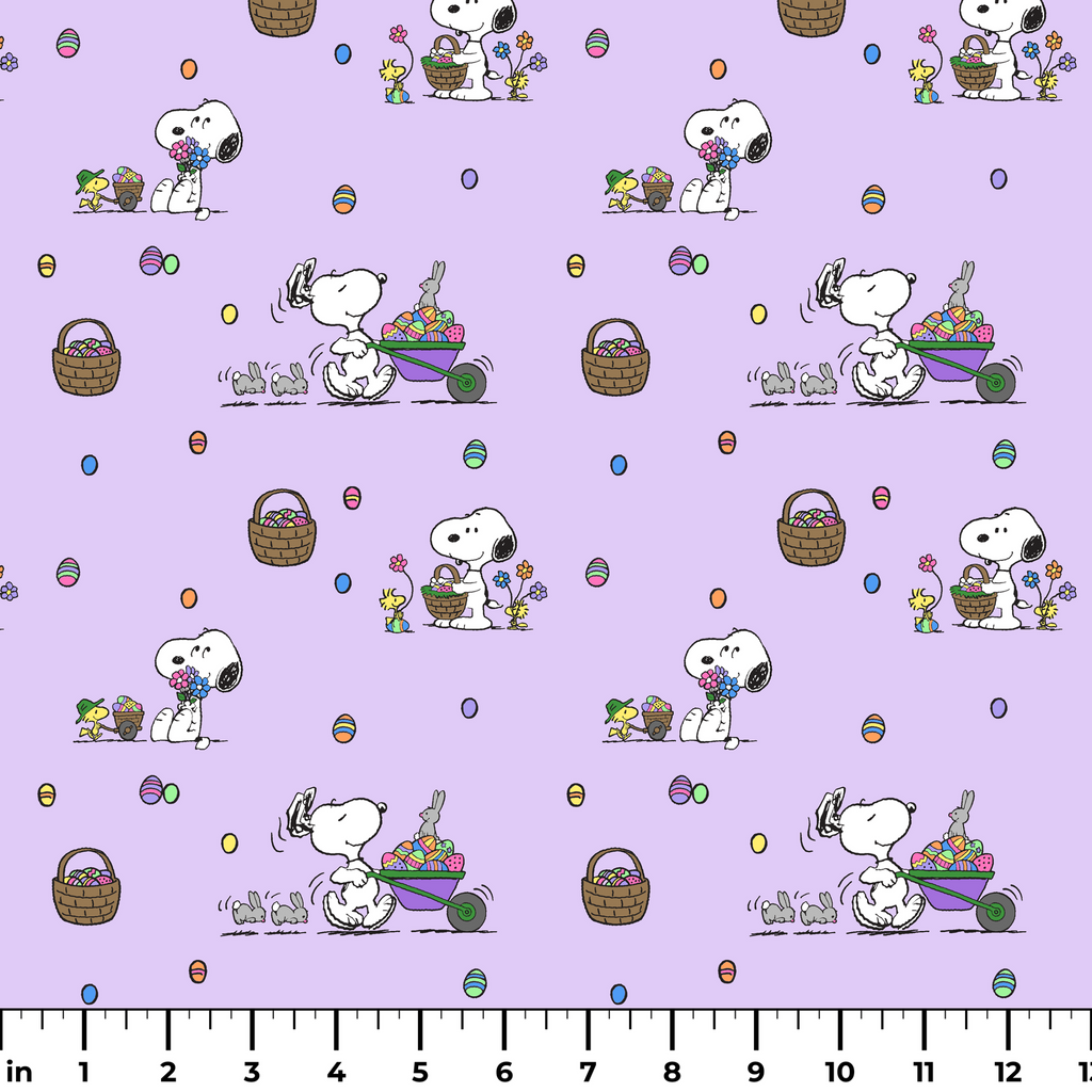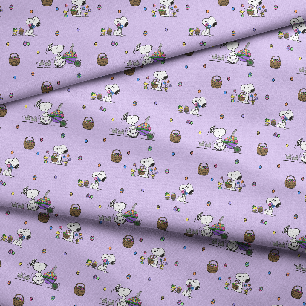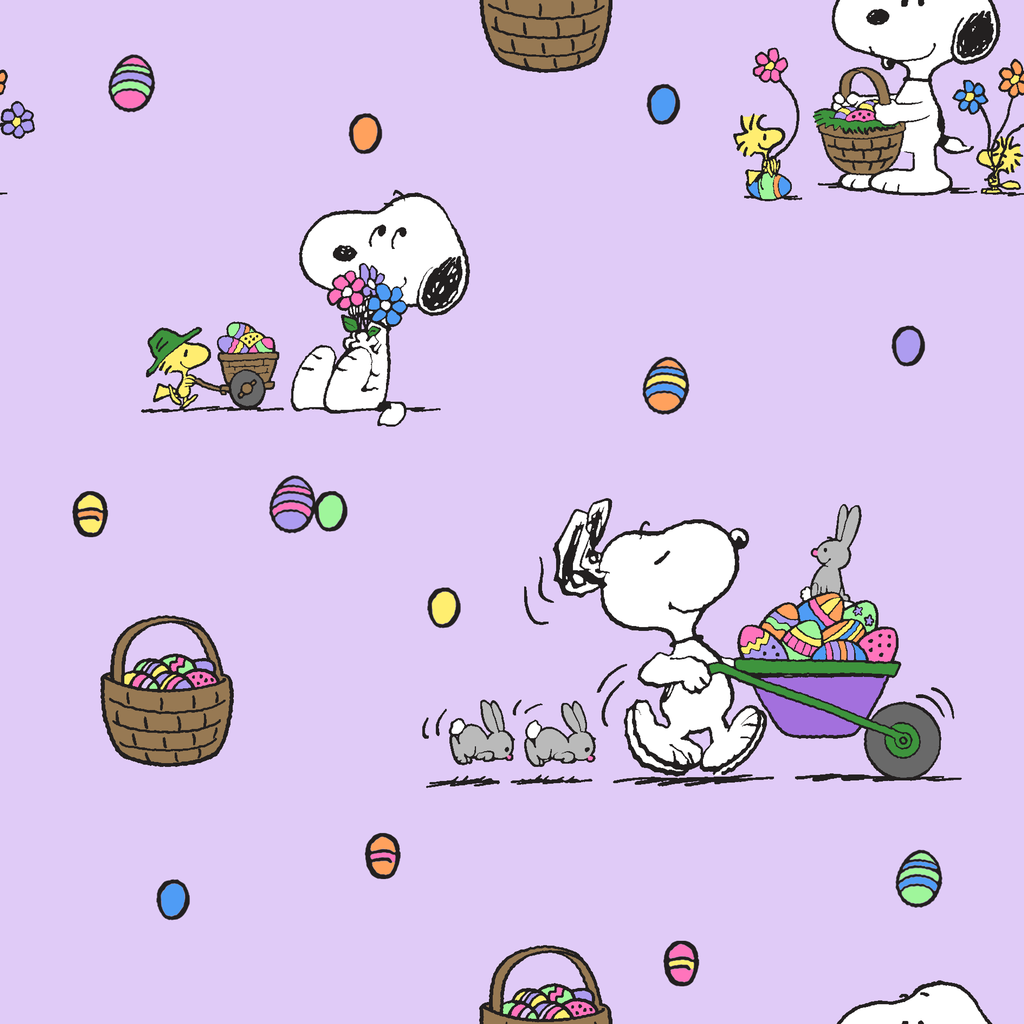 Adorable Peanuts Snoopy and Woodstock Easter pattern featuring the beloved Peanuts characters with colorful eggs, baskets and spring flowers on a soft purple background. Perfect for crafting projects or seasonal decor.