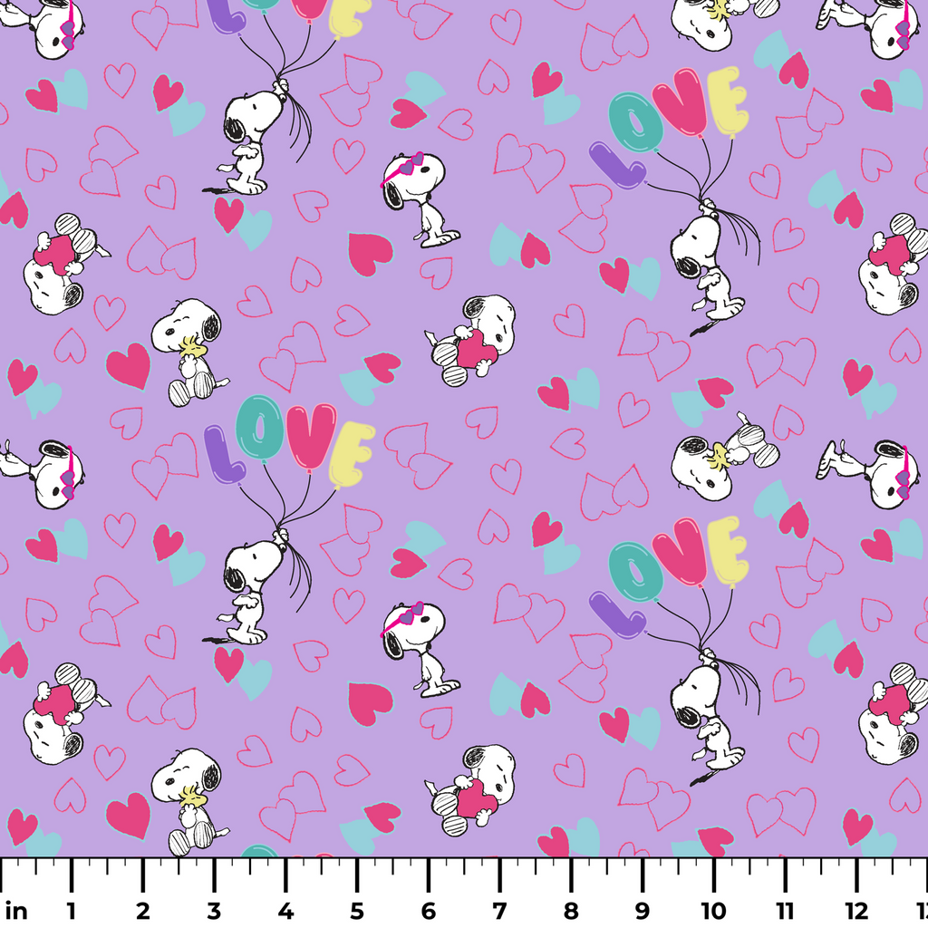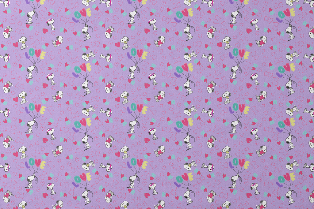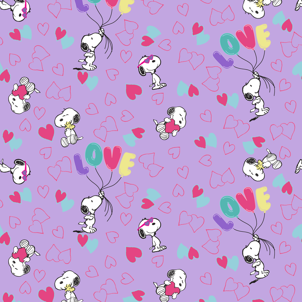 This adorable Peanuts Snoopy pattern showcases the beloved character floating with balloons with "LOVE" amid colorful hearts on a purple background, perfect for crafting or quilting projects.