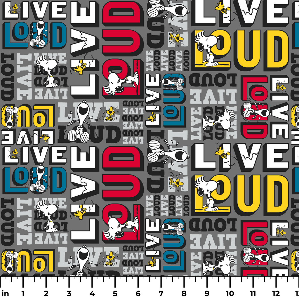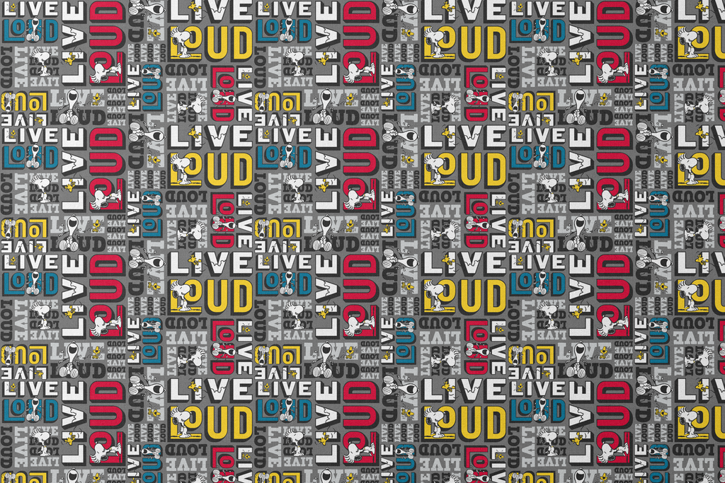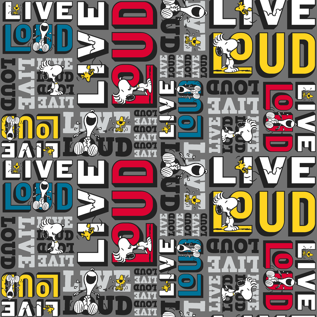 This fun Peanuts and Woodstock pattern features colorful LIVE LOUD typography in different colors on a gray background - perfect for fans of the beloved comic strip.