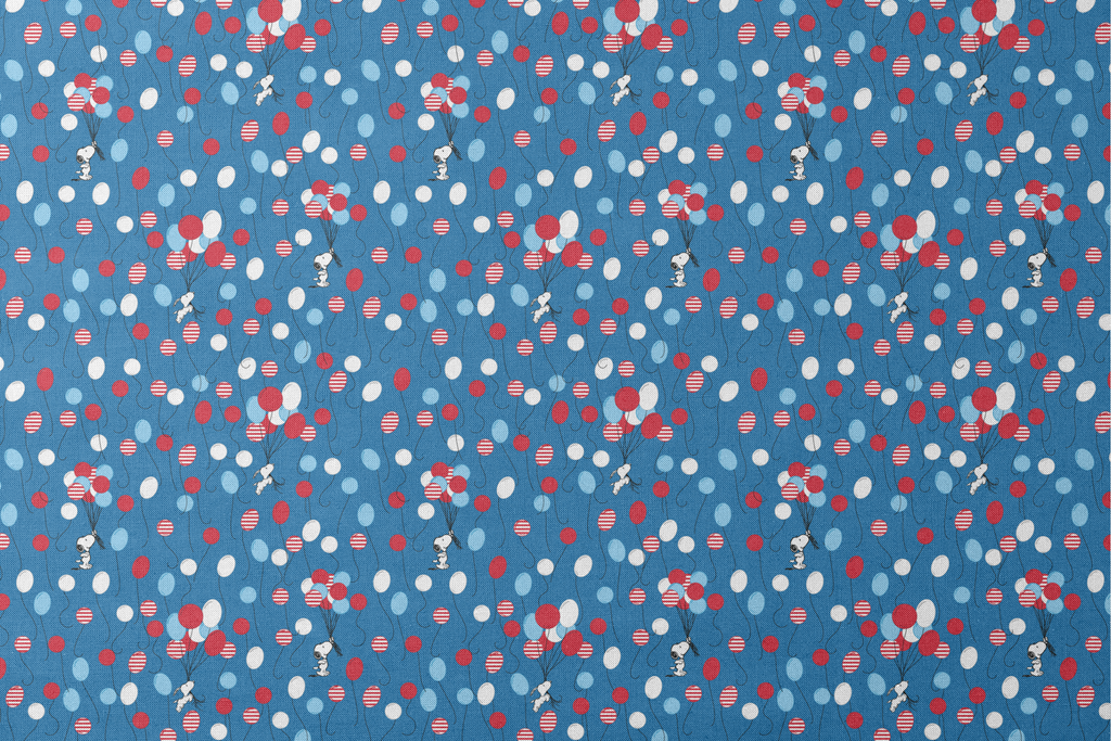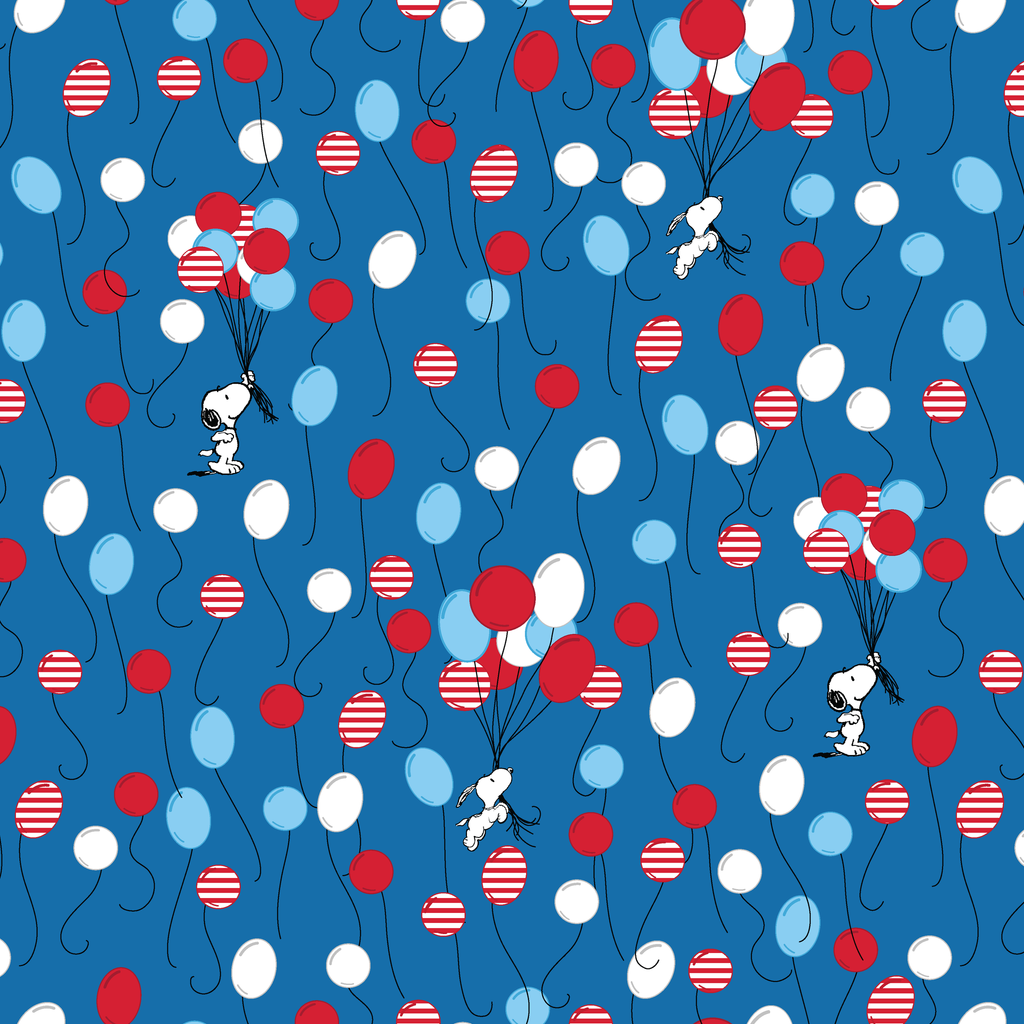 A festive patriotic pattern featuring cartoon Snoopy characters among red stars, white polka dots, and blue striped balloons on a vibrant blue background - perfect for Fourth of July celebrations.