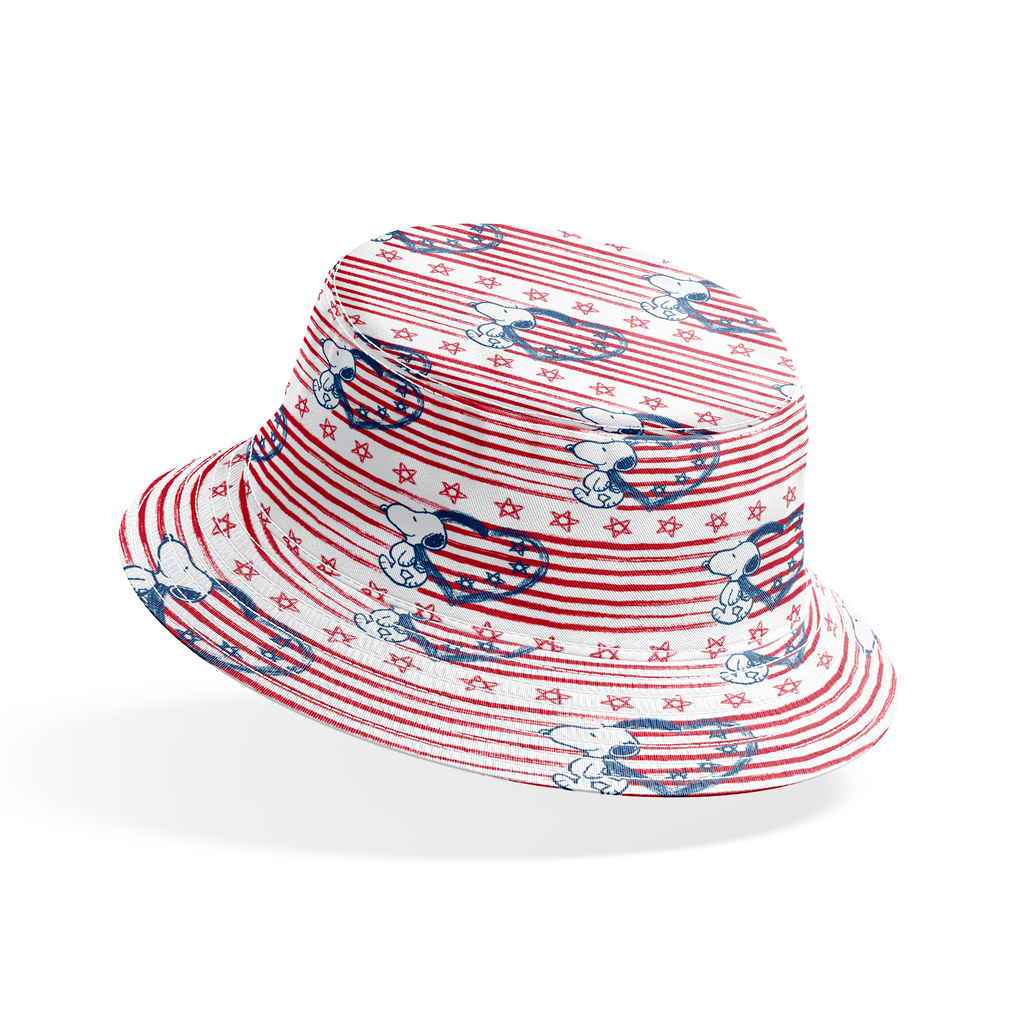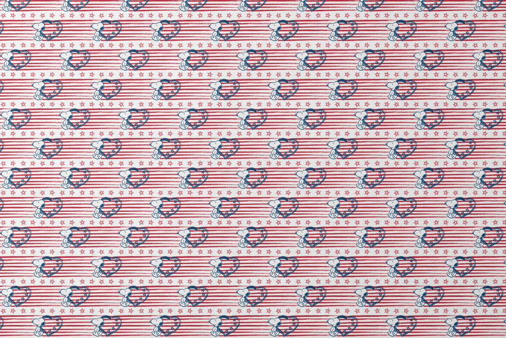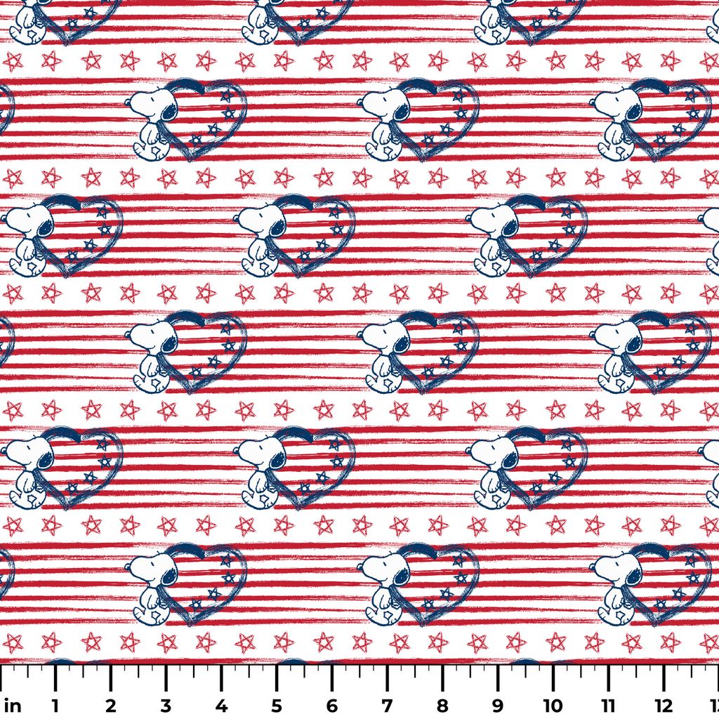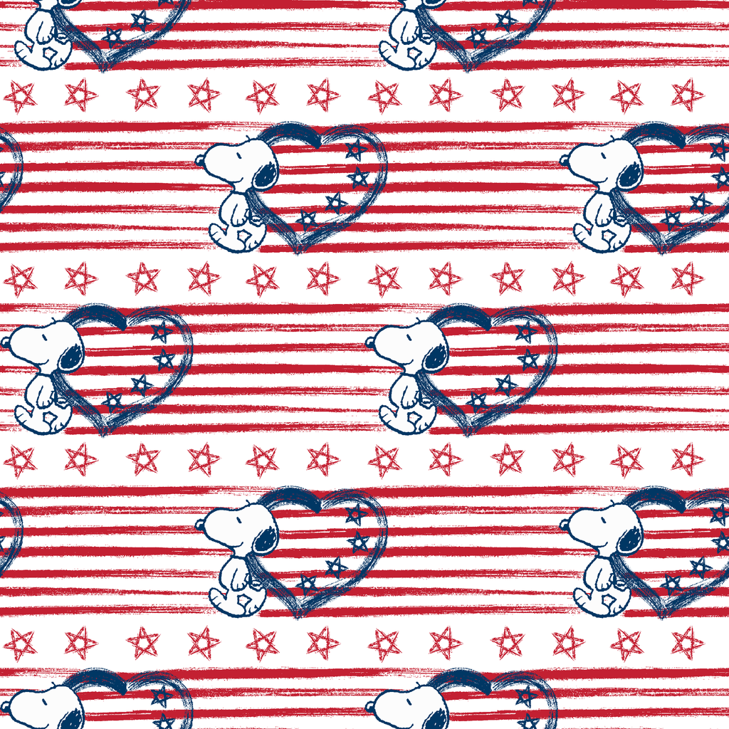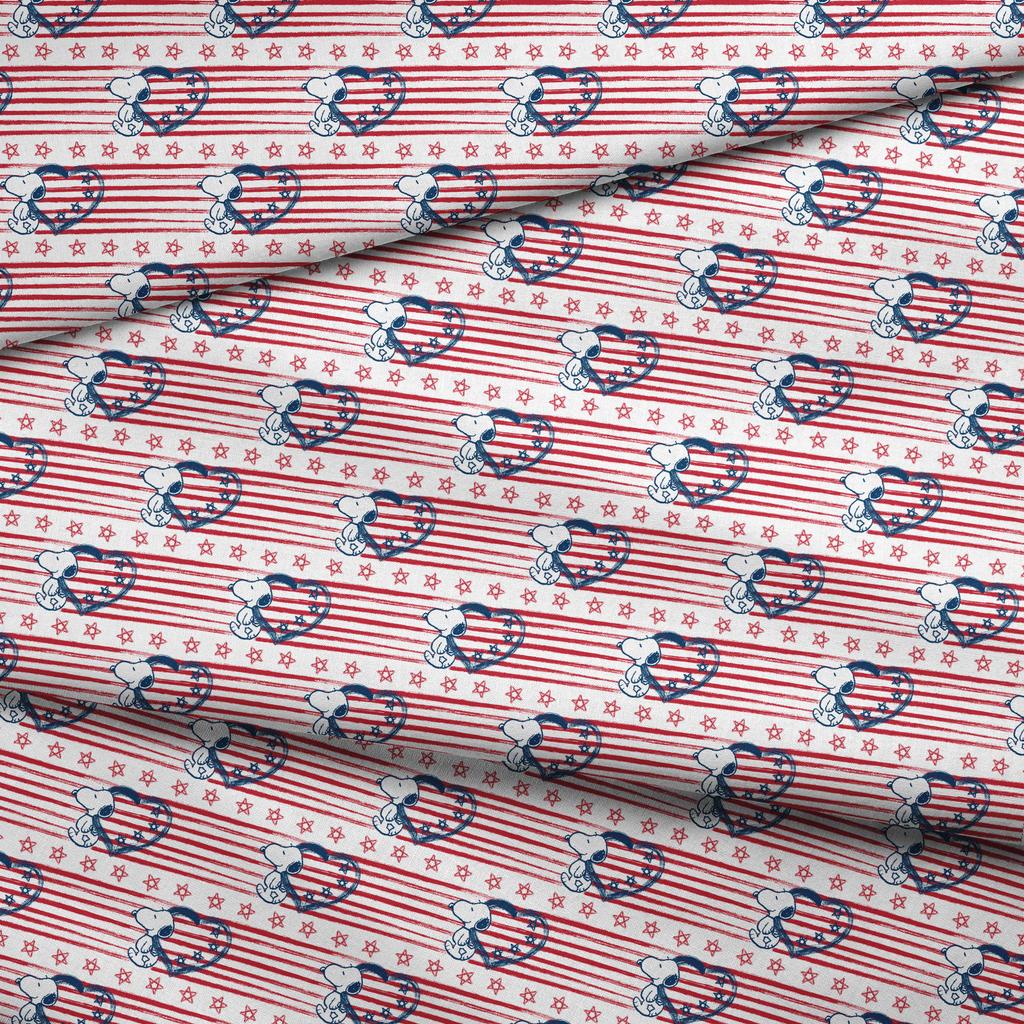 Patriotic Peanuts Snoopy pattern featuring the beloved character against a red striped background with blue accents and stars for a classic Americana look perfect for 4th of July celebrations.