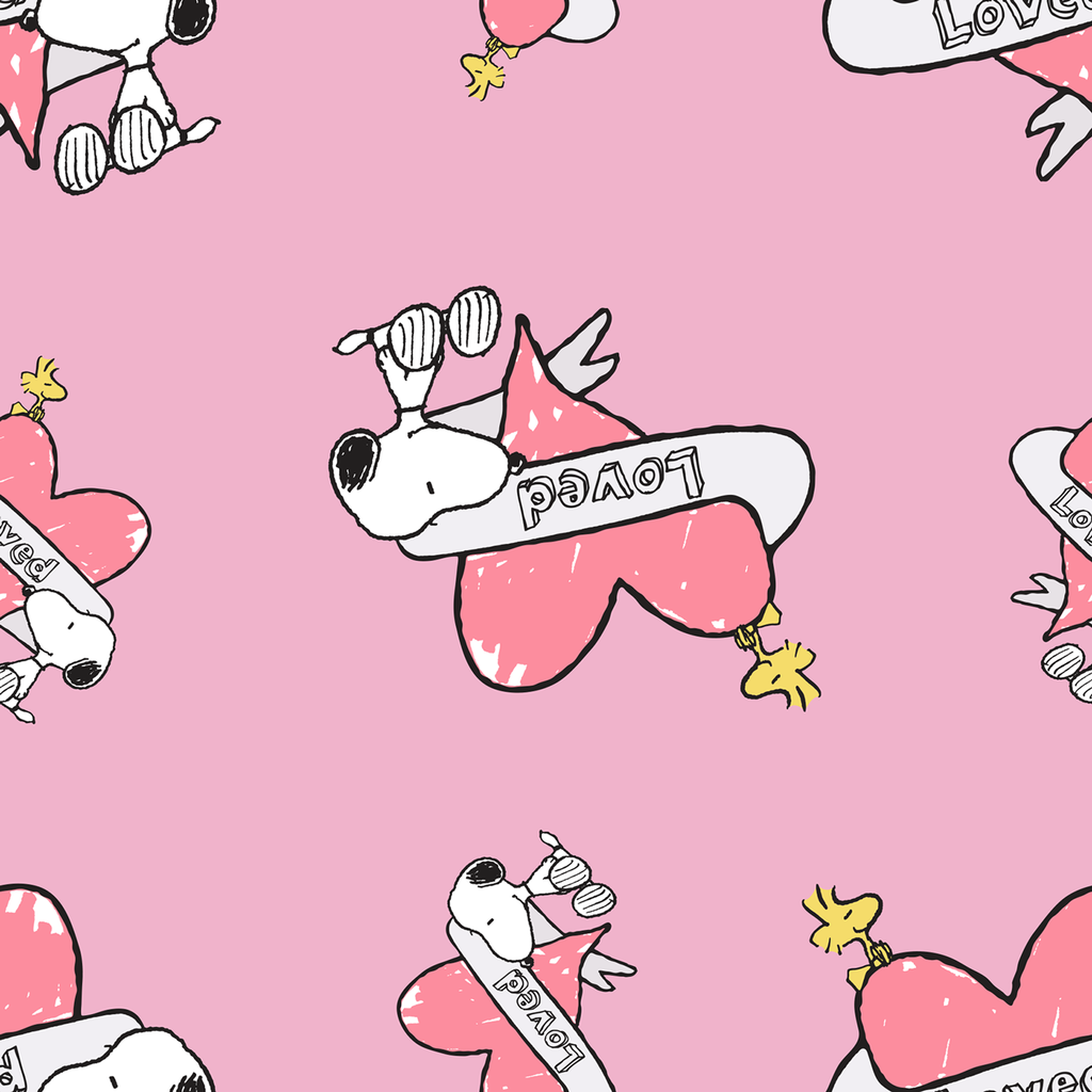 Adorable Peanuts Snoopy and Woodstock float on pink heart shapes with "LOVED" text on a sweet pink background. Perfect for crafting or room decor.