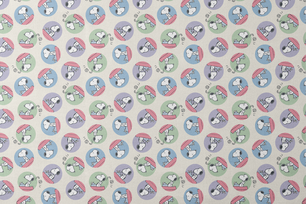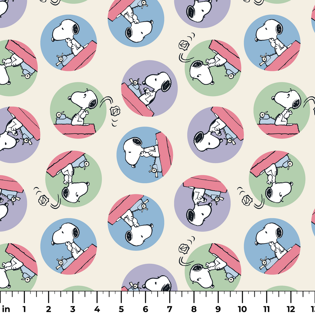 Adorable Snoopy pattern featuring the beloved beagle with dog houses with a typewriter in pastel blue and green circles. Perfect for kids' bedding, sleepwear, or craft projects.