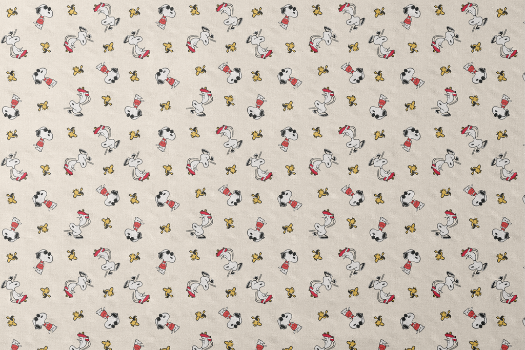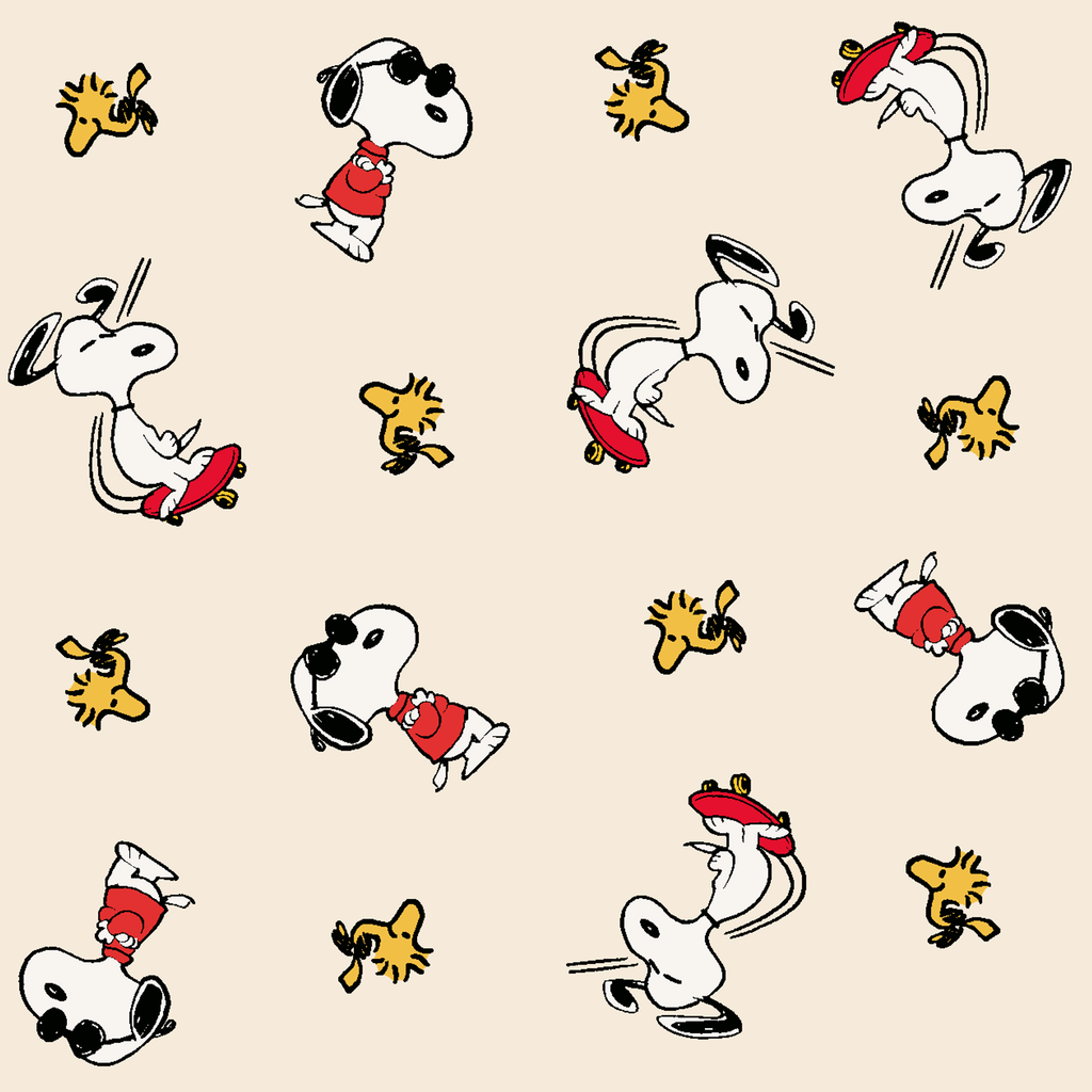 Classic Snoopy in red and Woodstock on a beige background. Perfect for vintage-inspired children's apparel or nursery decor.