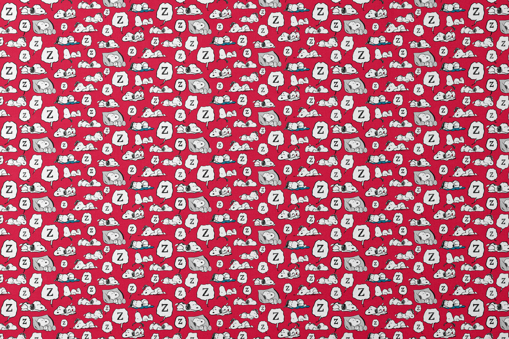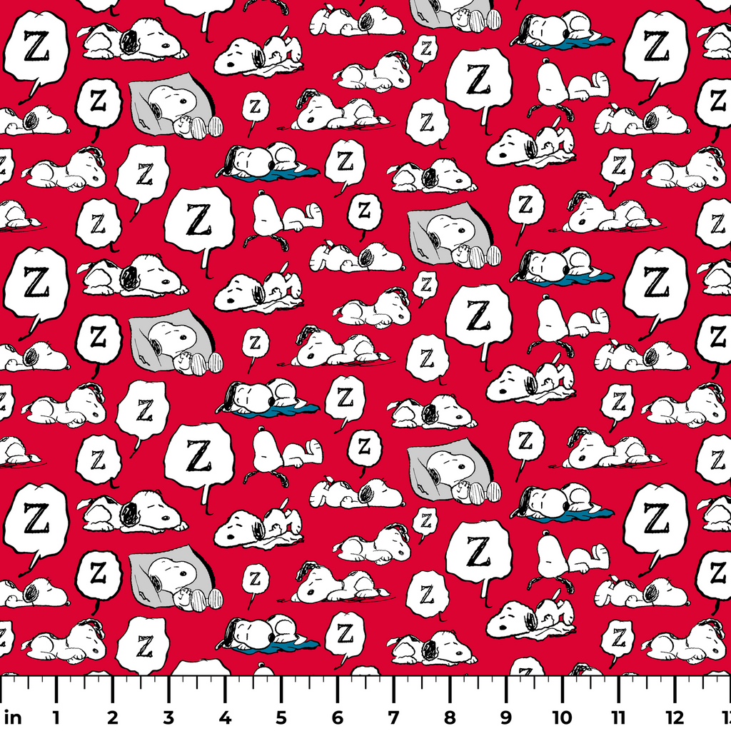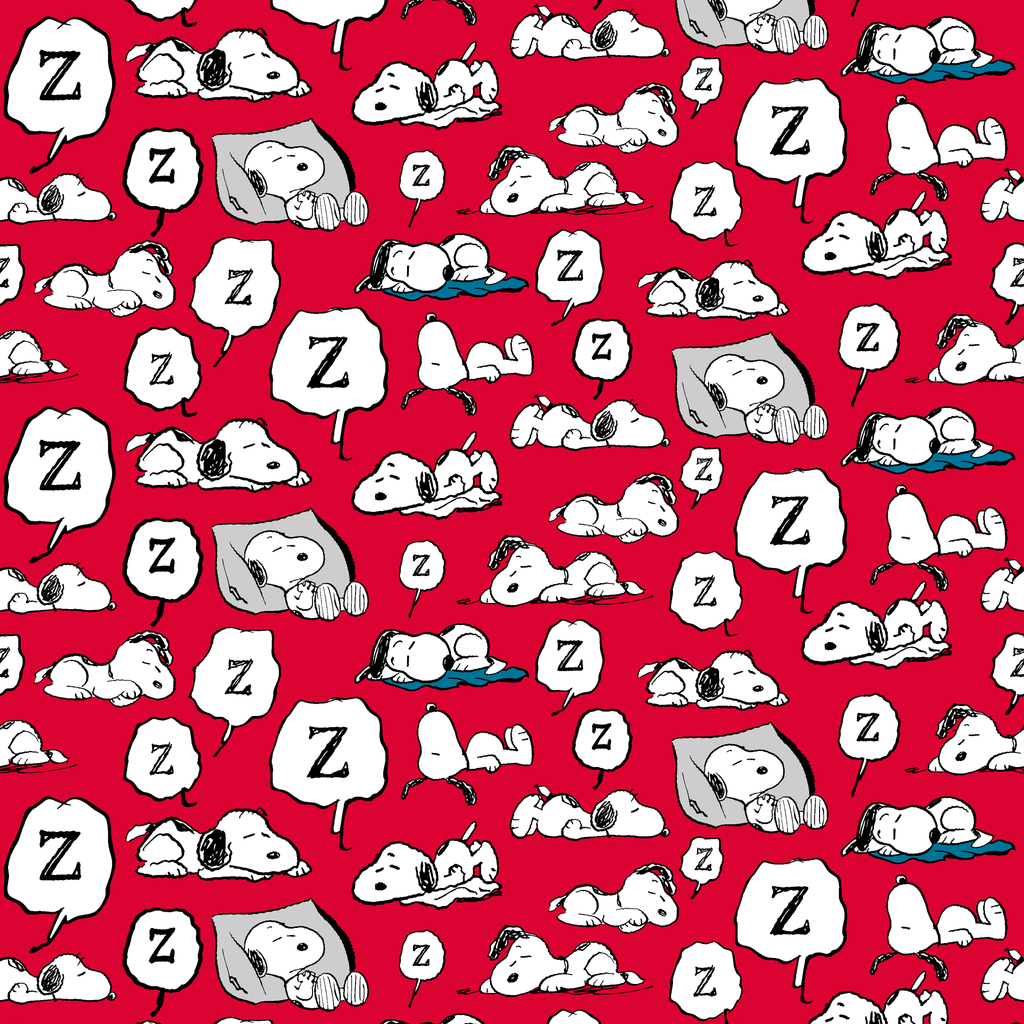 This adorable Peanuts Snoopy pattern showcases "ZZZ" and various poses of Snoopy sleeping on a vibrant red background. Perfect for nursery decor or crafting projects.
