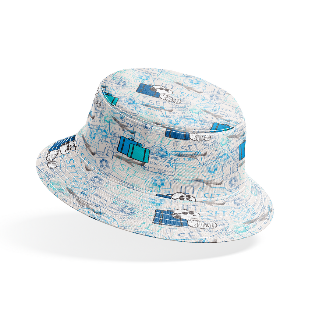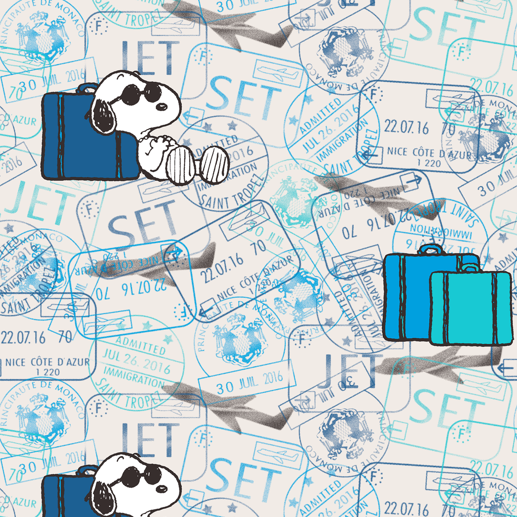Adorable Peanuts Snoopy relaxing against blue luggage on a travel passport stamps background. Perfect for the jet-setting Peanuts fan who loves adventure.