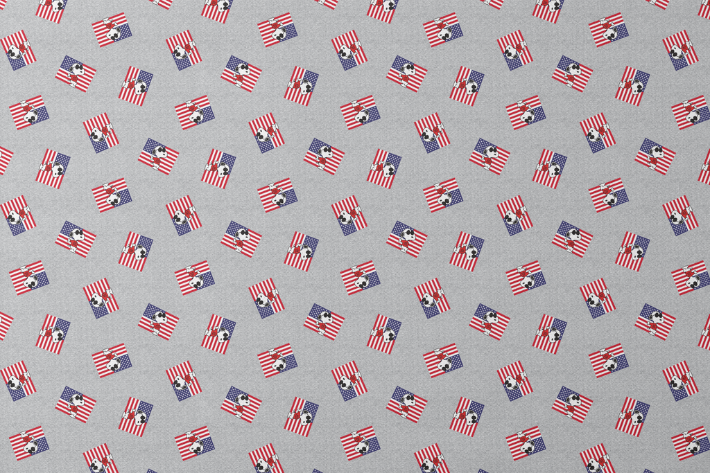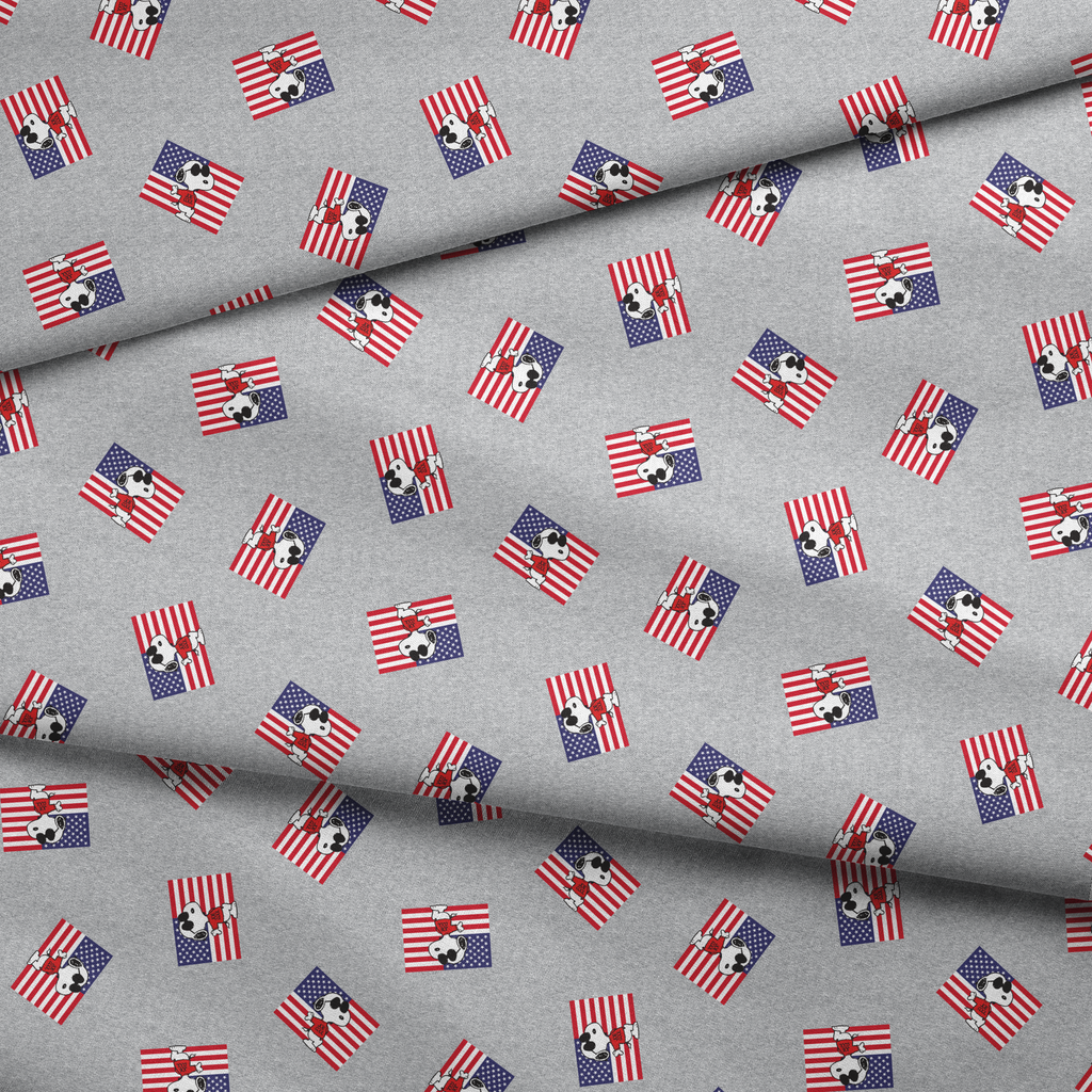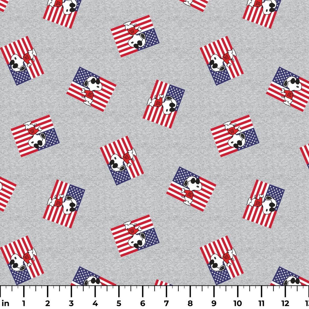 This patriotic Peanuts toss features American flags with Snoopy lounging scattered across a light gray background - perfect for crafting projects and USA pride!