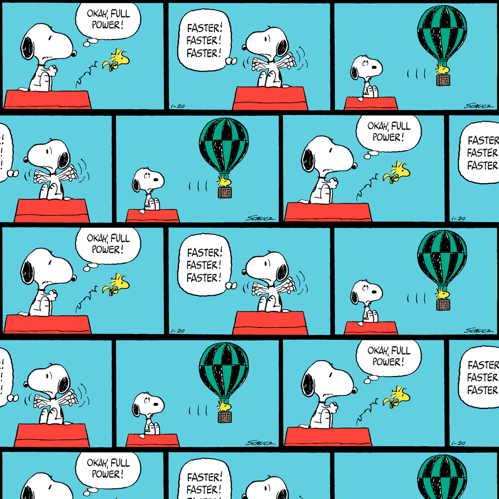 This adorable Peanuts comic strip shows Snoopy attempting to operate a hot air balloon, followed by his eager commands of "Faster!" and Woodstock. Perfect for fans of this iconic comic.