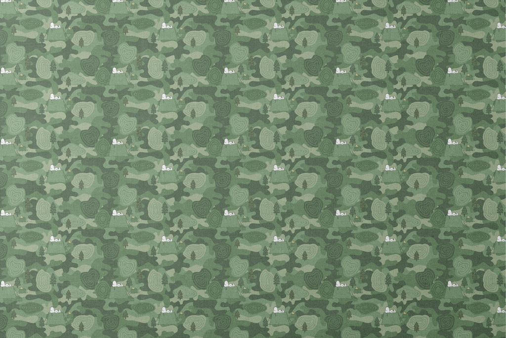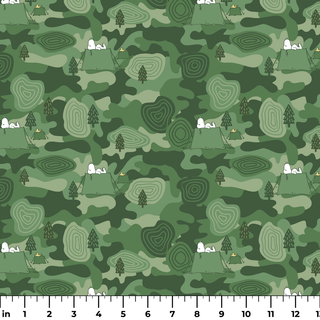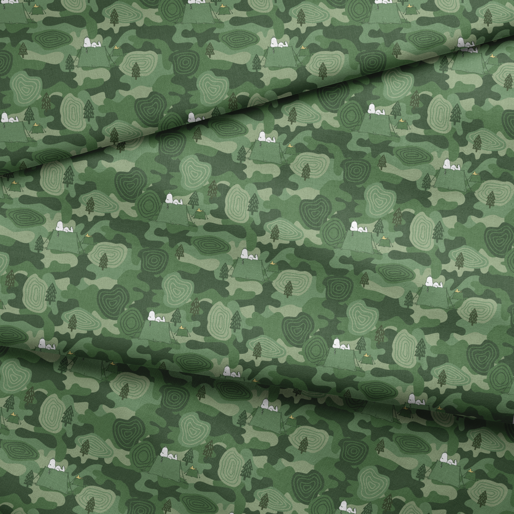 Camouflage Snoopy camping scene with green topographic pattern, small tents, pine trees, and a cozy hideaway on a mountain peak. Perfect for outdoor adventure and Snoopy lovers