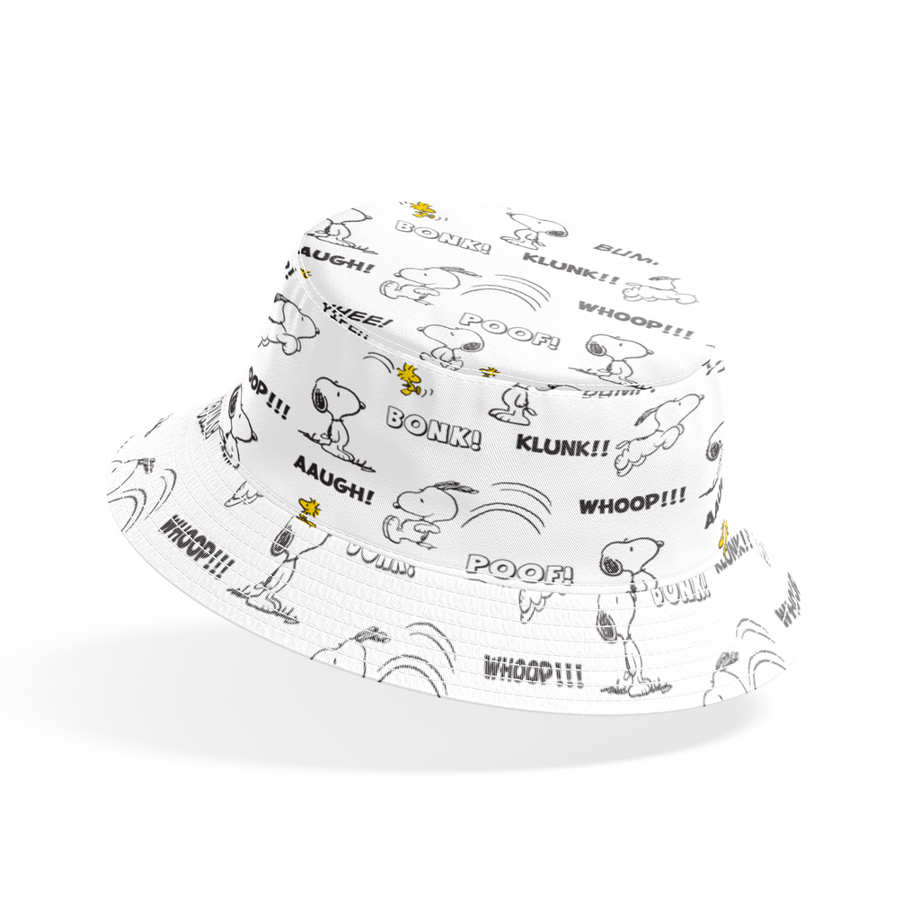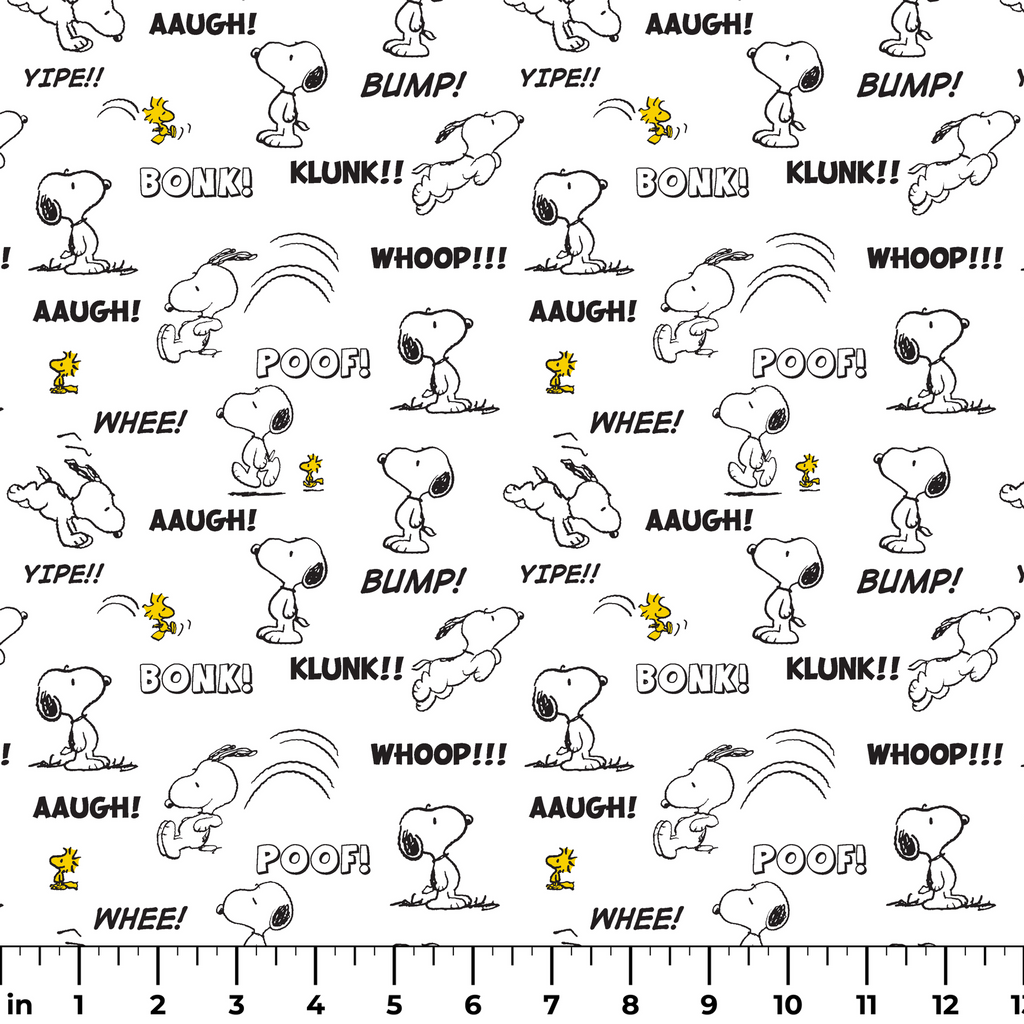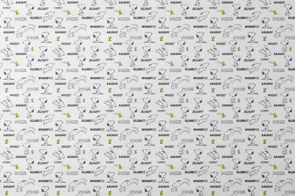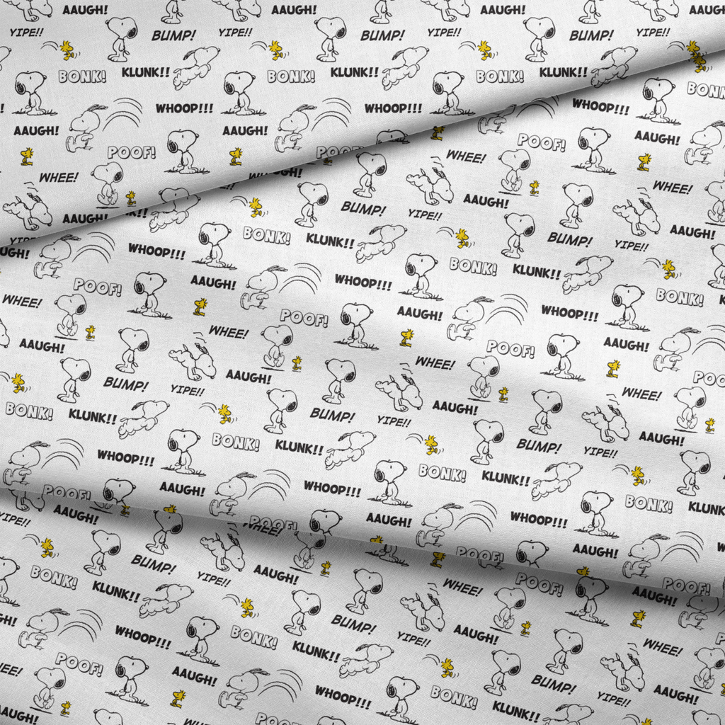 Classic Peanuts comic strip pattern featuring Snoopy and Woodstock in playful action poses with sound effect words like "BONK!" "POOF!" and "BUMP!" in a fun cartoon style.