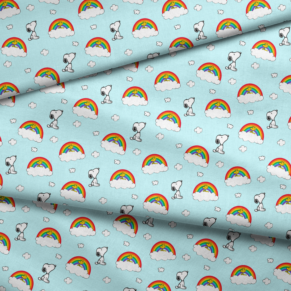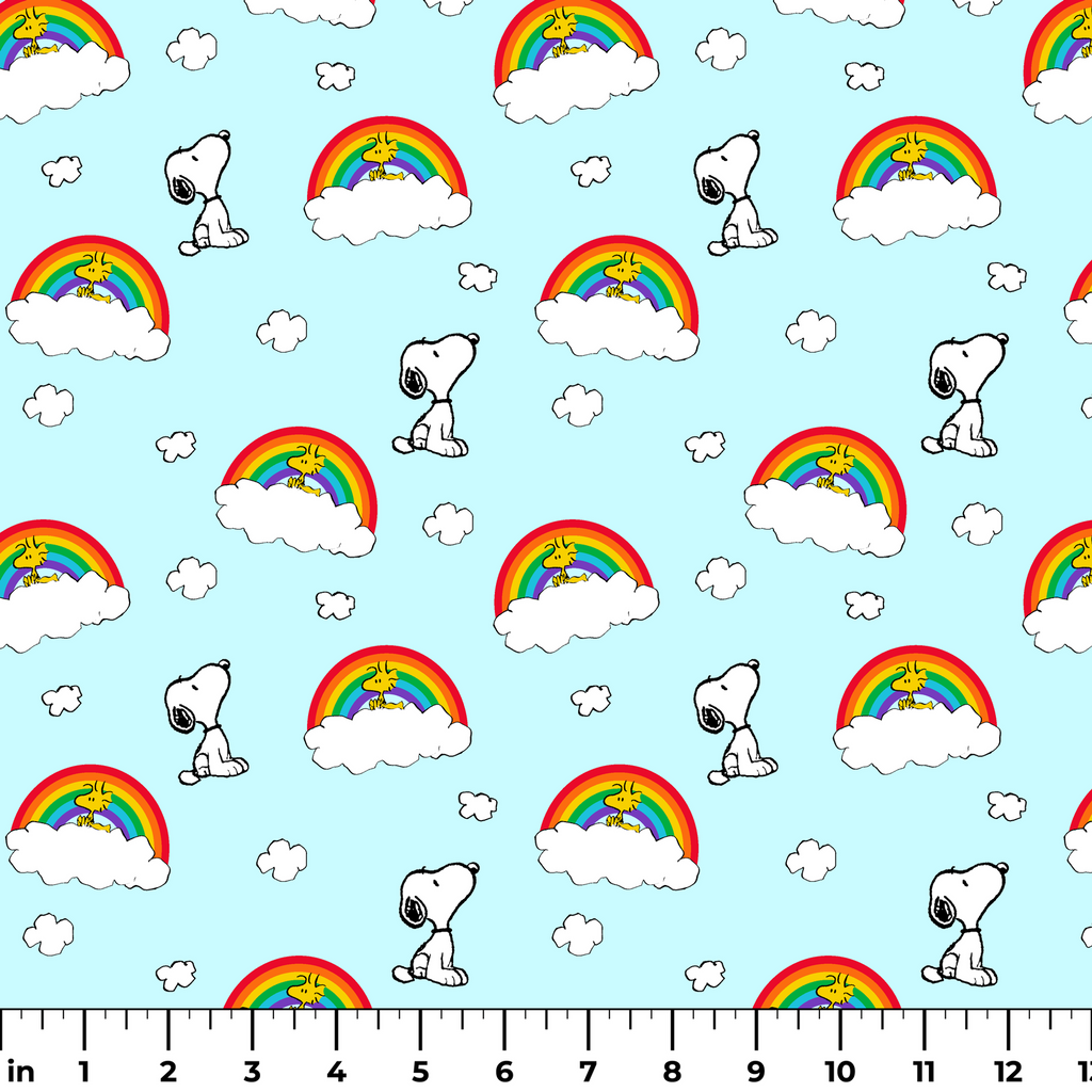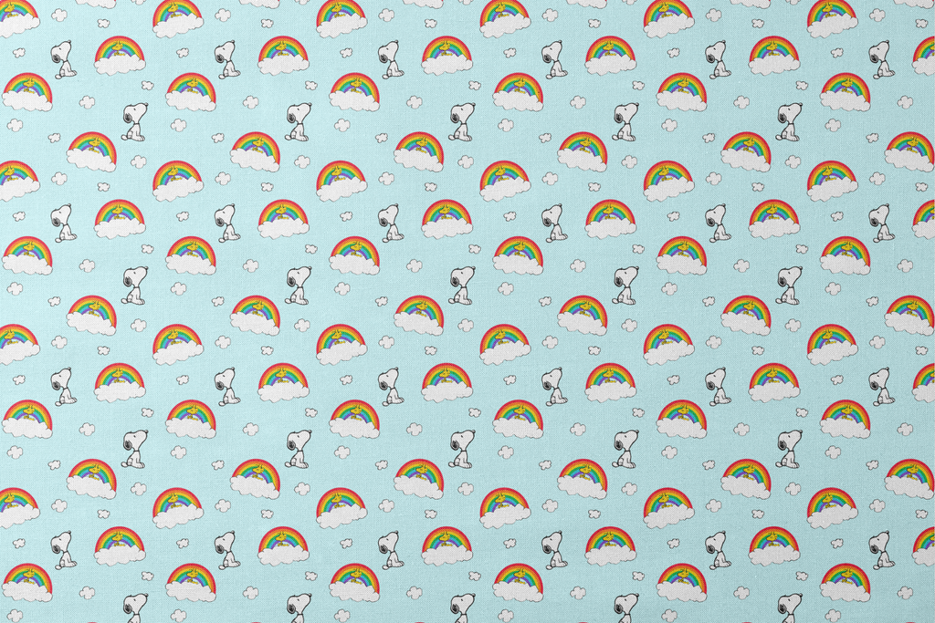 Adorable Snoopy and Woodstock cartoon pattern featuring the beloved Peanuts characters with vibrant rainbows on a light blue background. Perfect for kids' decor, nostalgic fans, and colorful nursery themes.